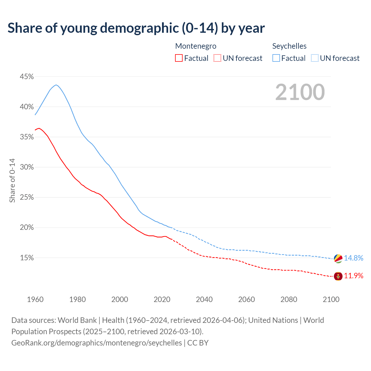 - The share of young demographic (0-15 years old) in Montenegro is 18.1% vs 20% in the Seychelles.