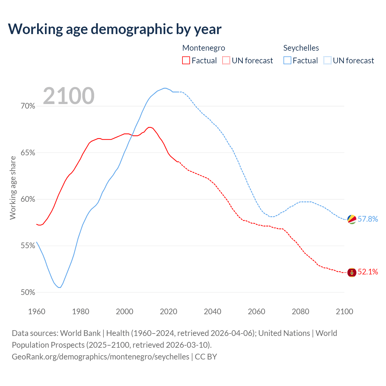 - Montenegro has 392K working age adults (aged 15-64) vs 90.3K in the Seychelles.