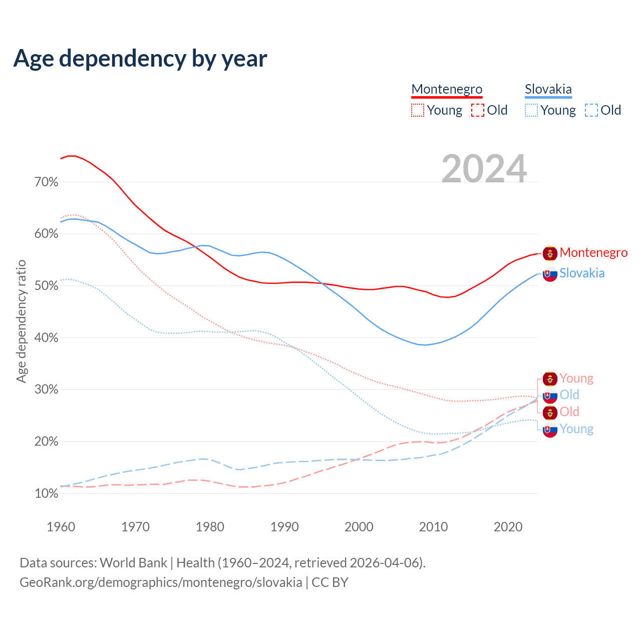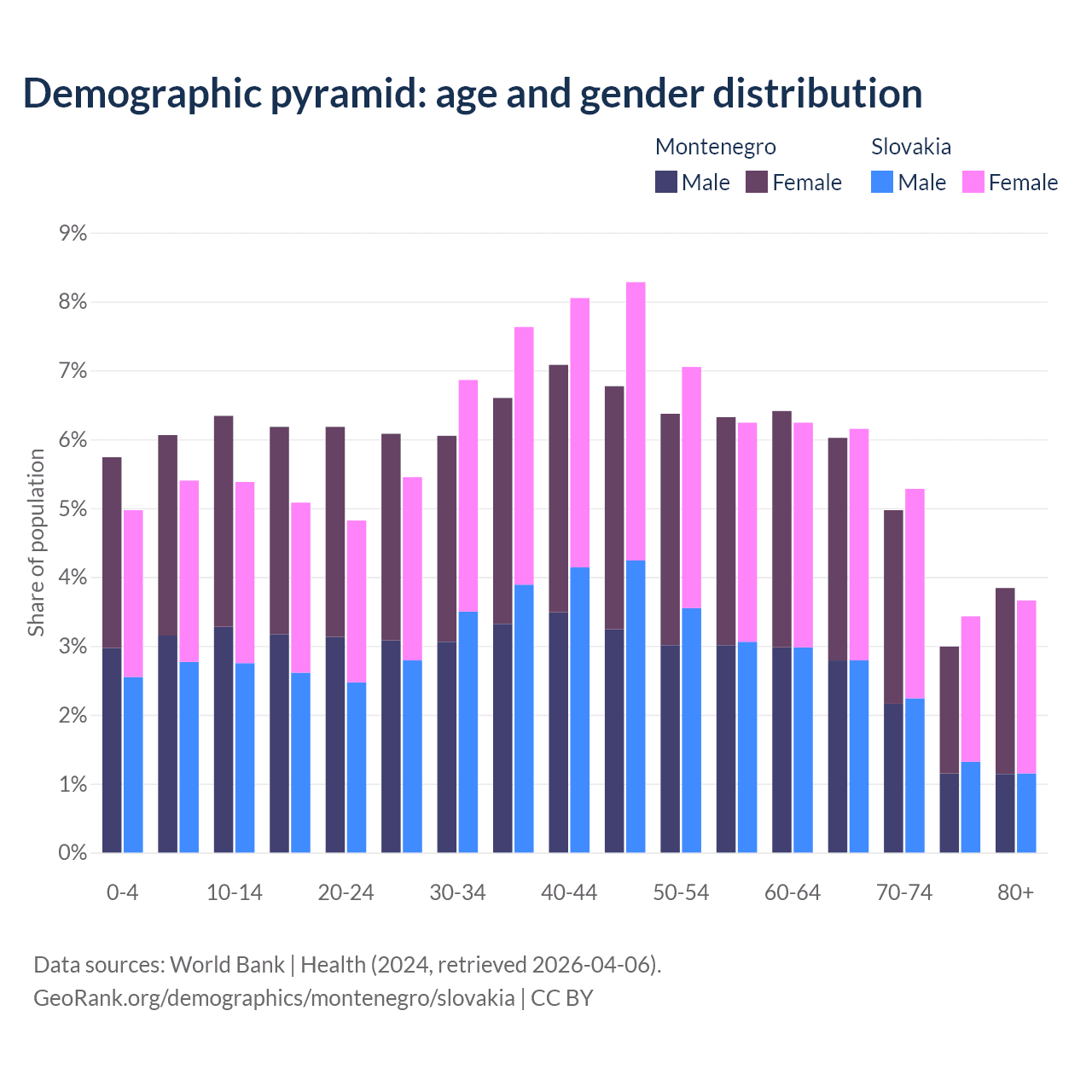 - Montenegro is ranked 45/196 by median age (oldest to youngest) vs 31/196 for Slovakia.