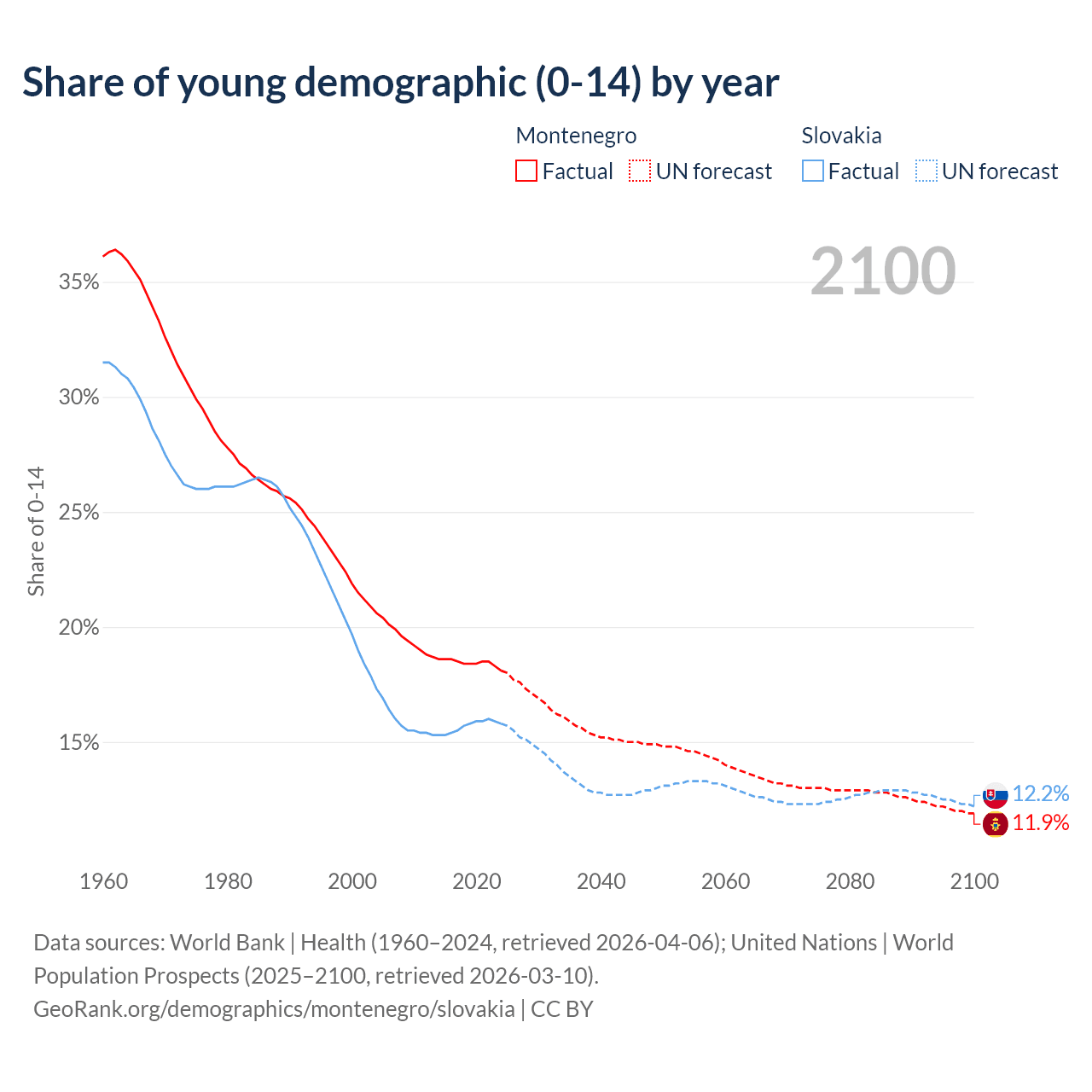 - The share of young demographic (0-15 years old) in Montenegro is 18.1% vs 15.8% in Slovakia.