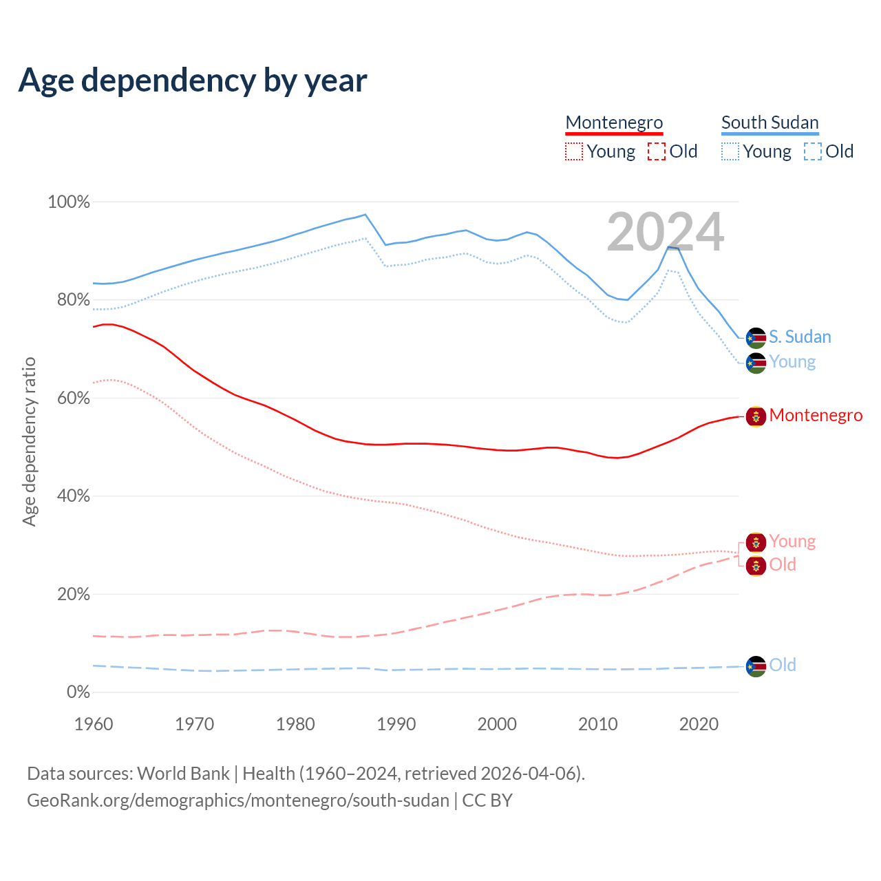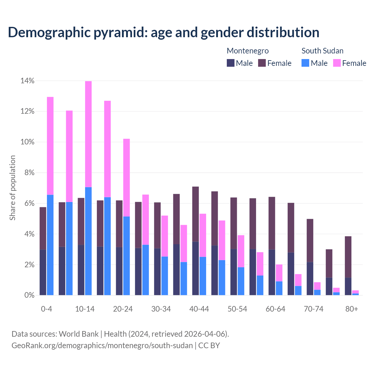 - Montenegro is ranked 45/196 by median age (oldest to youngest) vs 173/196 for South Sudan.