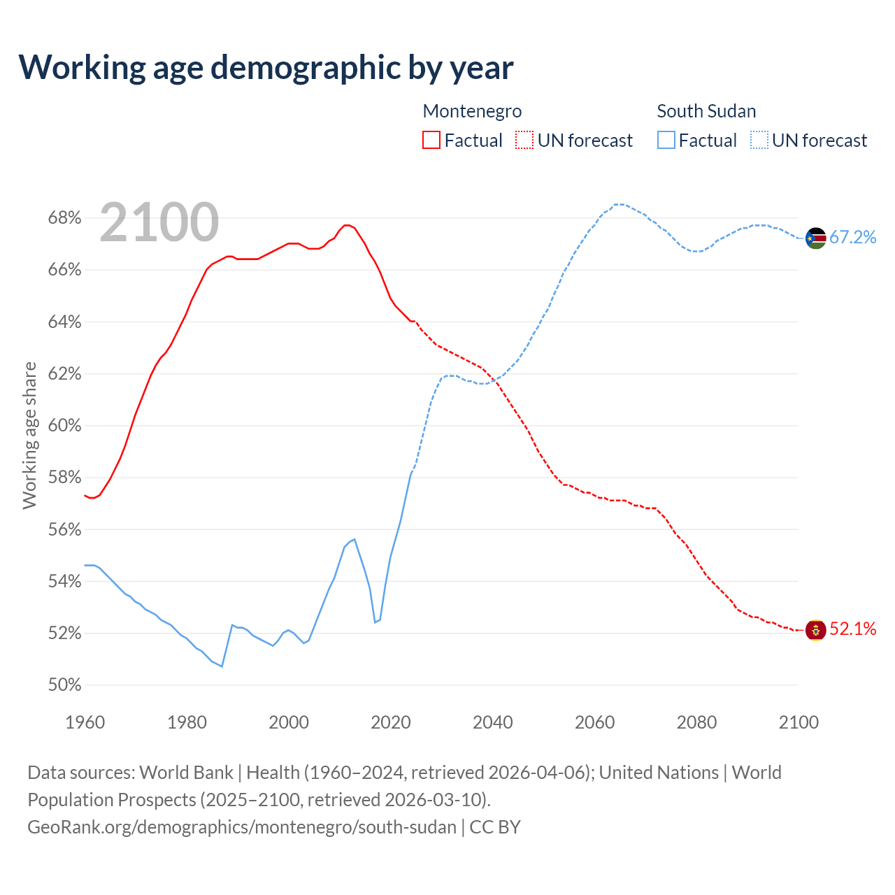- Montenegro has 392K working age adults (aged 15-64) vs 7.27M in South Sudan.