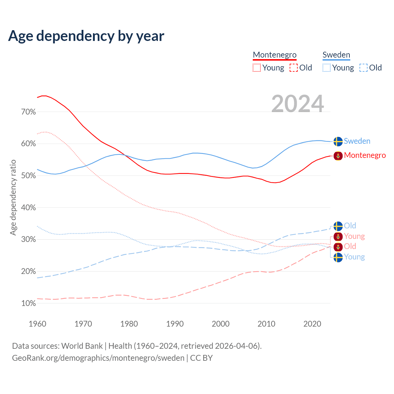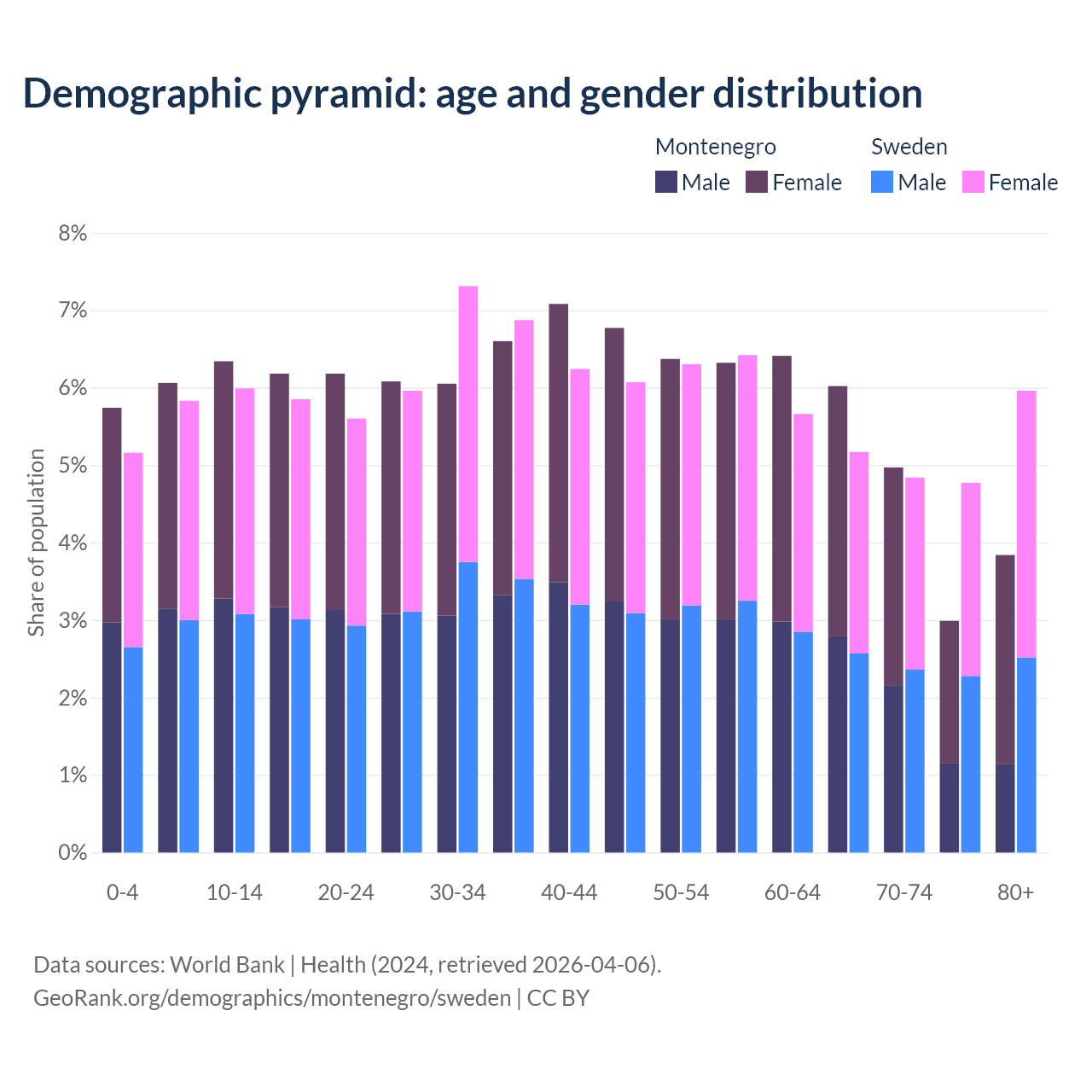 - Montenegro is ranked 45/196 by median age (oldest to youngest) vs 39/196 for Sweden.