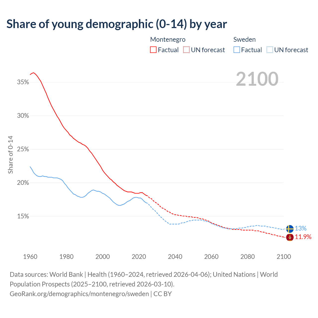 - The share of young demographic (0-15 years old) in Montenegro is 18.1% vs 17% in Sweden.