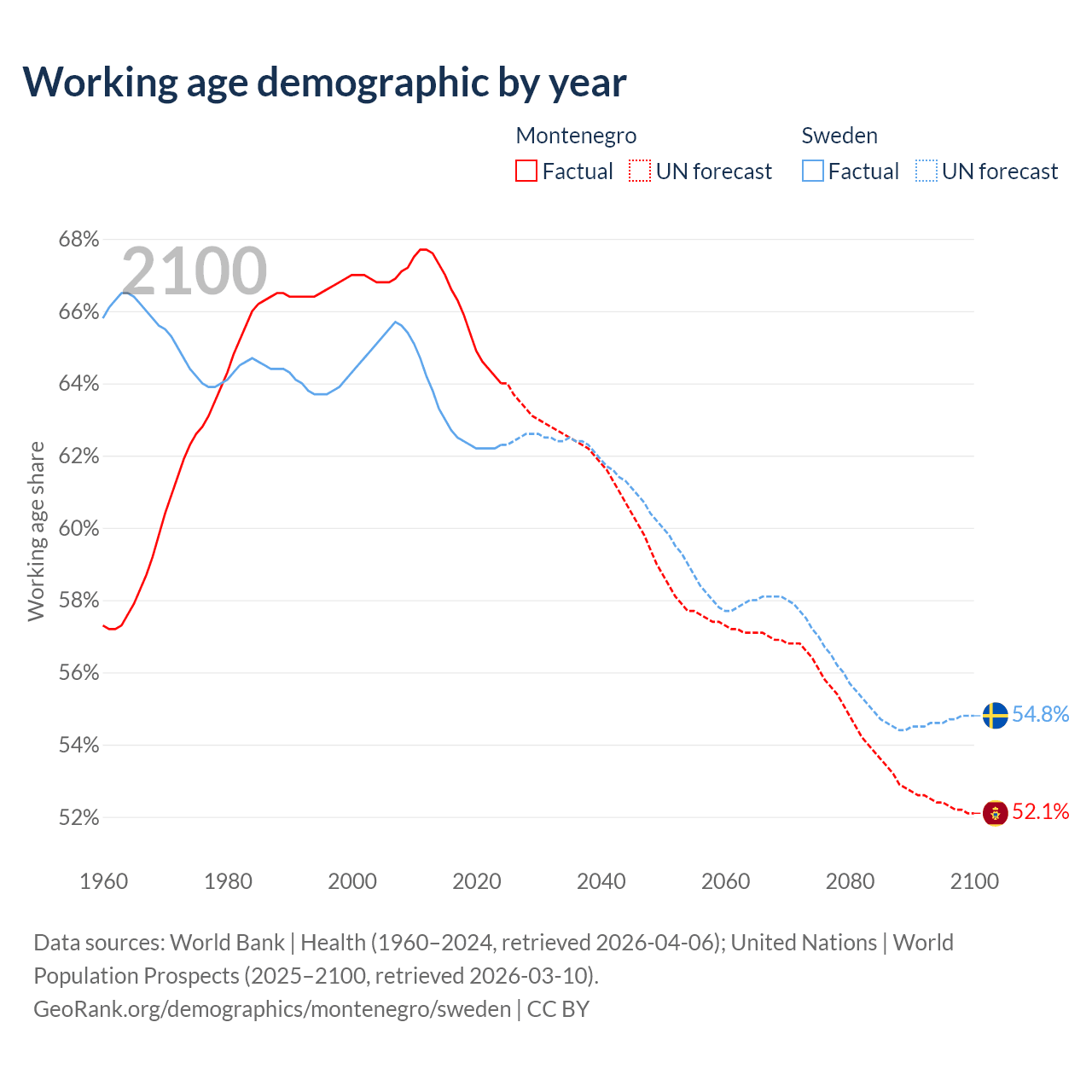 Median age Montenegro vs Sweden, 1960-2100