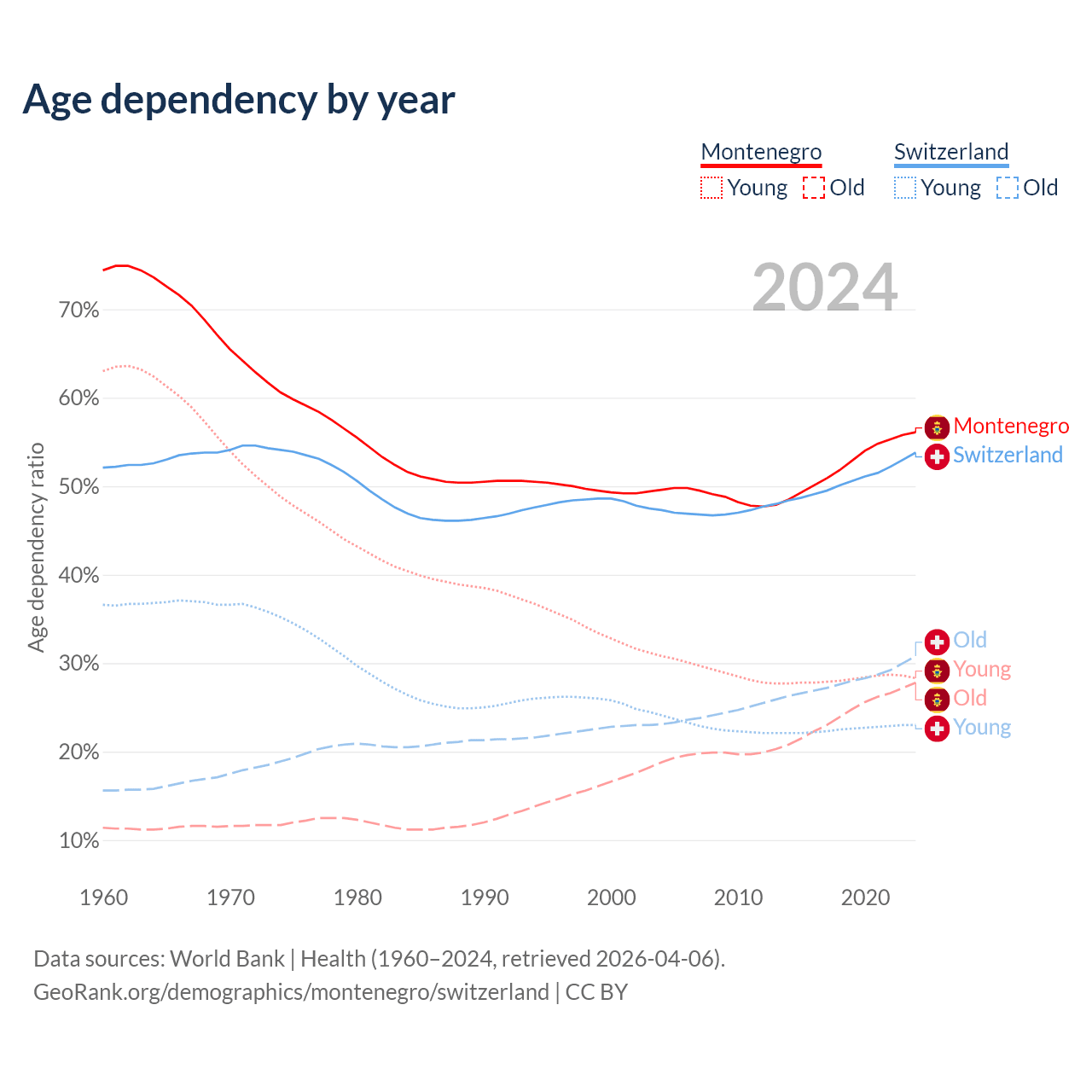 The share of older people aged 65 and over is 17.8% in Montenegro and 20% in Switzerland. Life expectancy in Montenegro compared to Switzerland .