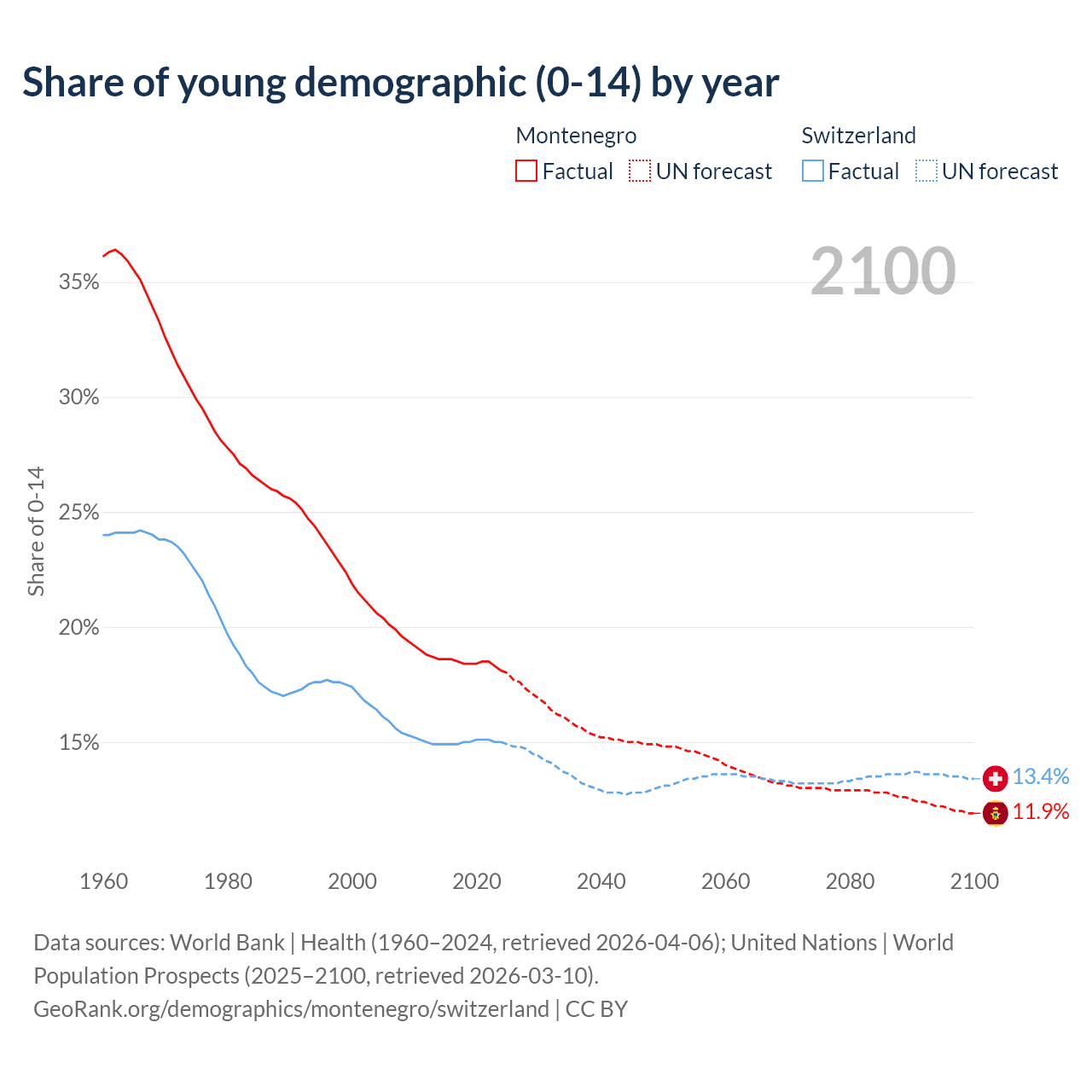 - The share of young demographic (0-15 years old) in Montenegro is 18.1% vs 15% in Switzerland.