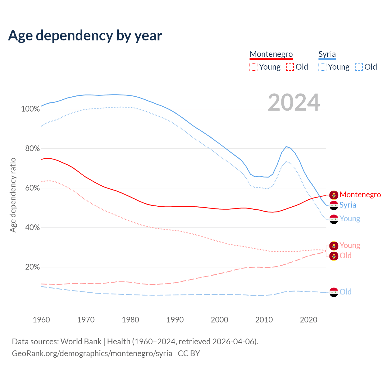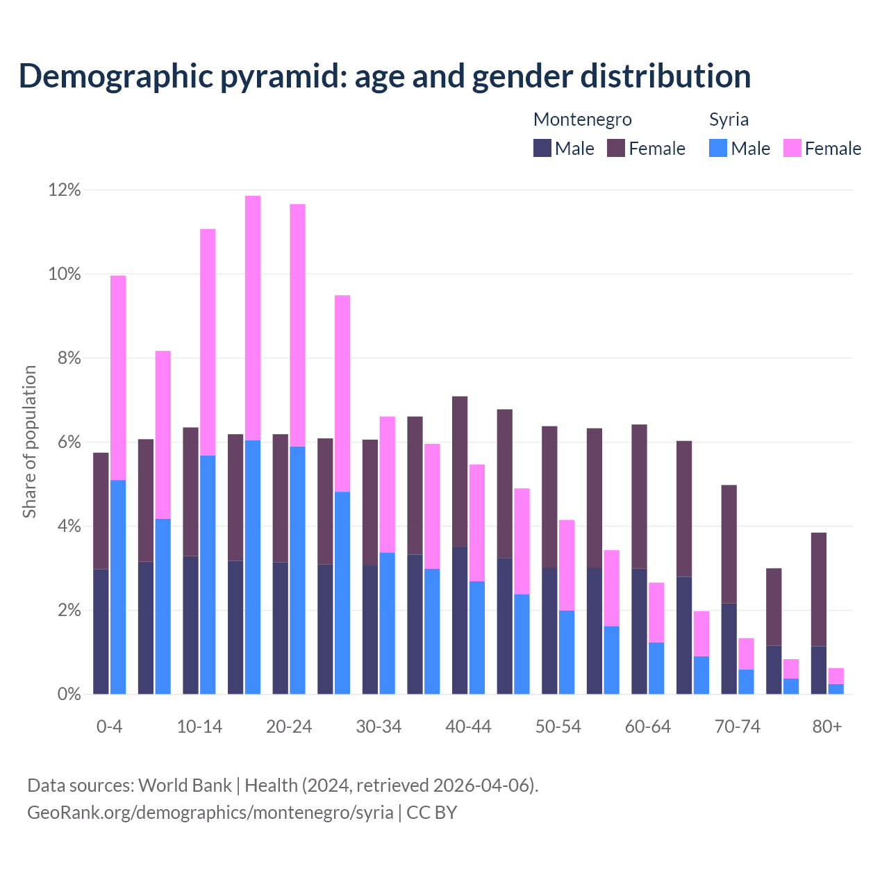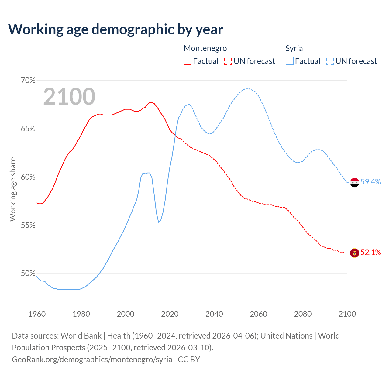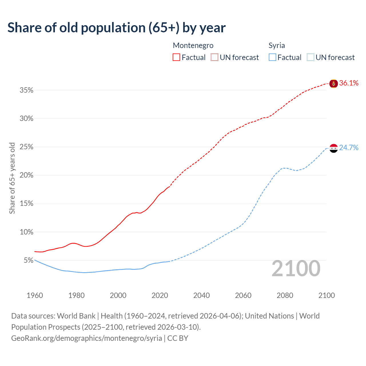 - The share of old-age demographic (65+) in Montenegro is 17.8% vs 4.74% in Syria.