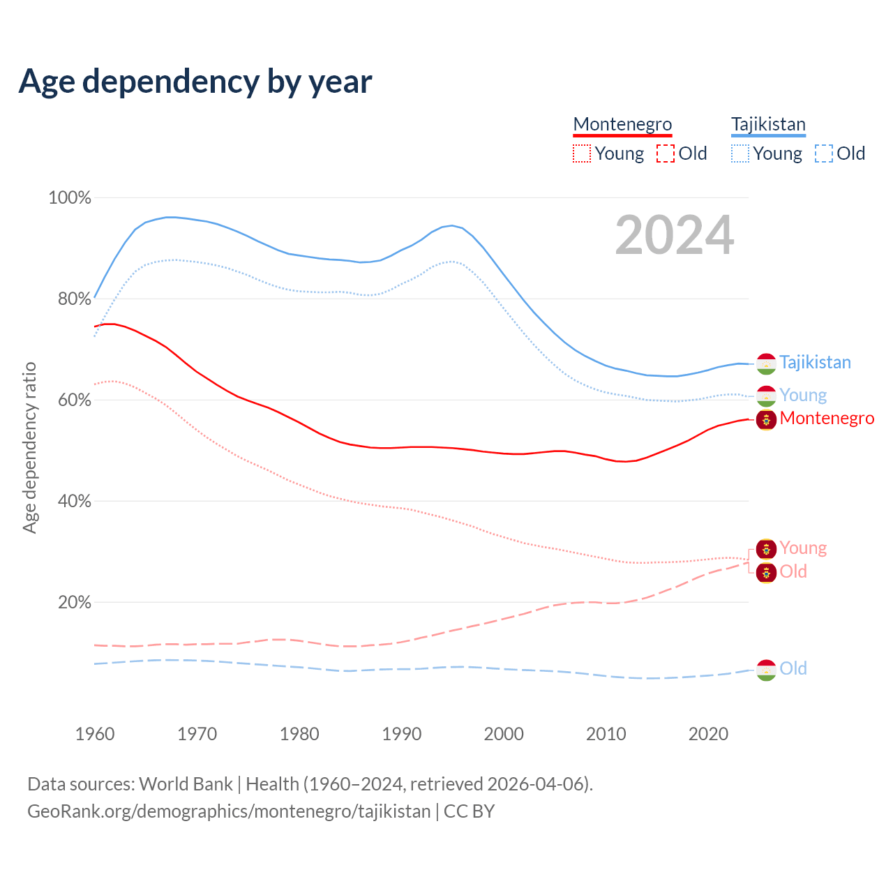 - The share of old-age demographic (65+) in Montenegro is 17.8% vs 3.85% in Tajikistan.