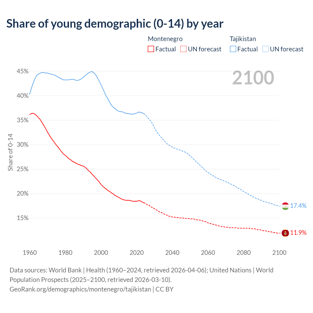 - The share of young demographic (0-15 years old) in Montenegro is 18.1% vs 36.3% in Tajikistan.