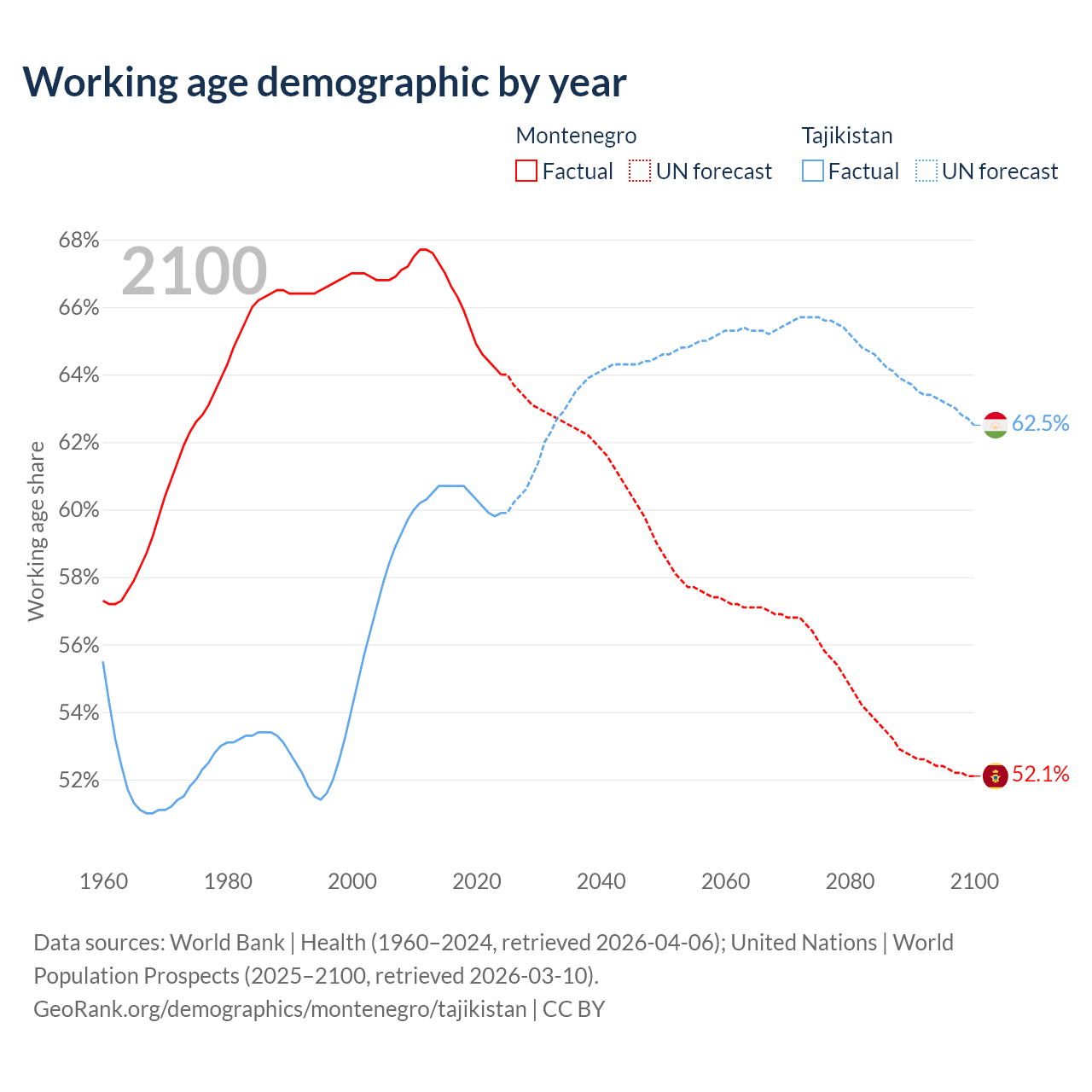 - Montenegro has 392K working age adults (aged 15-64) vs 6.61M in Tajikistan.