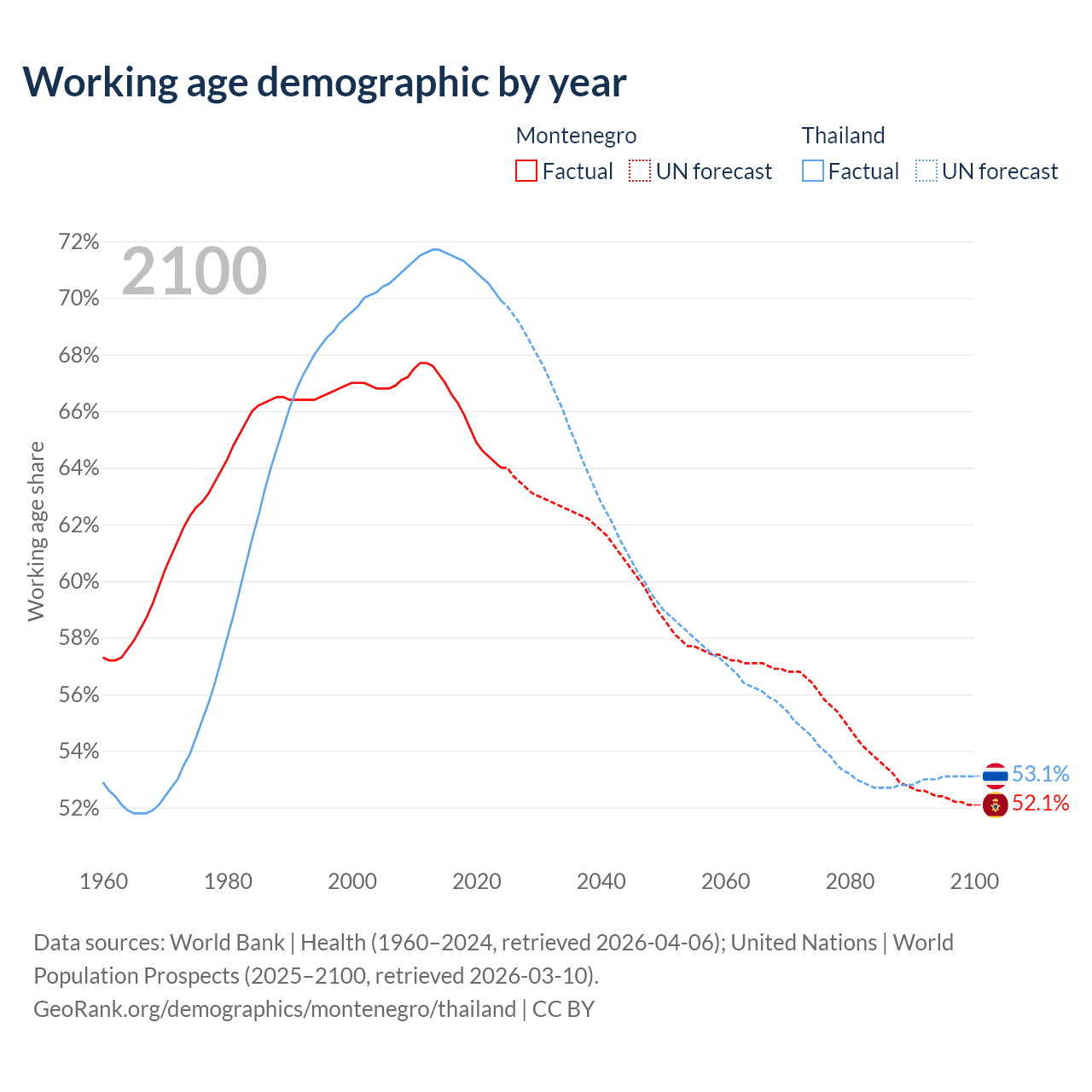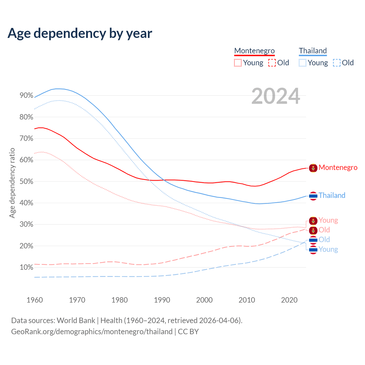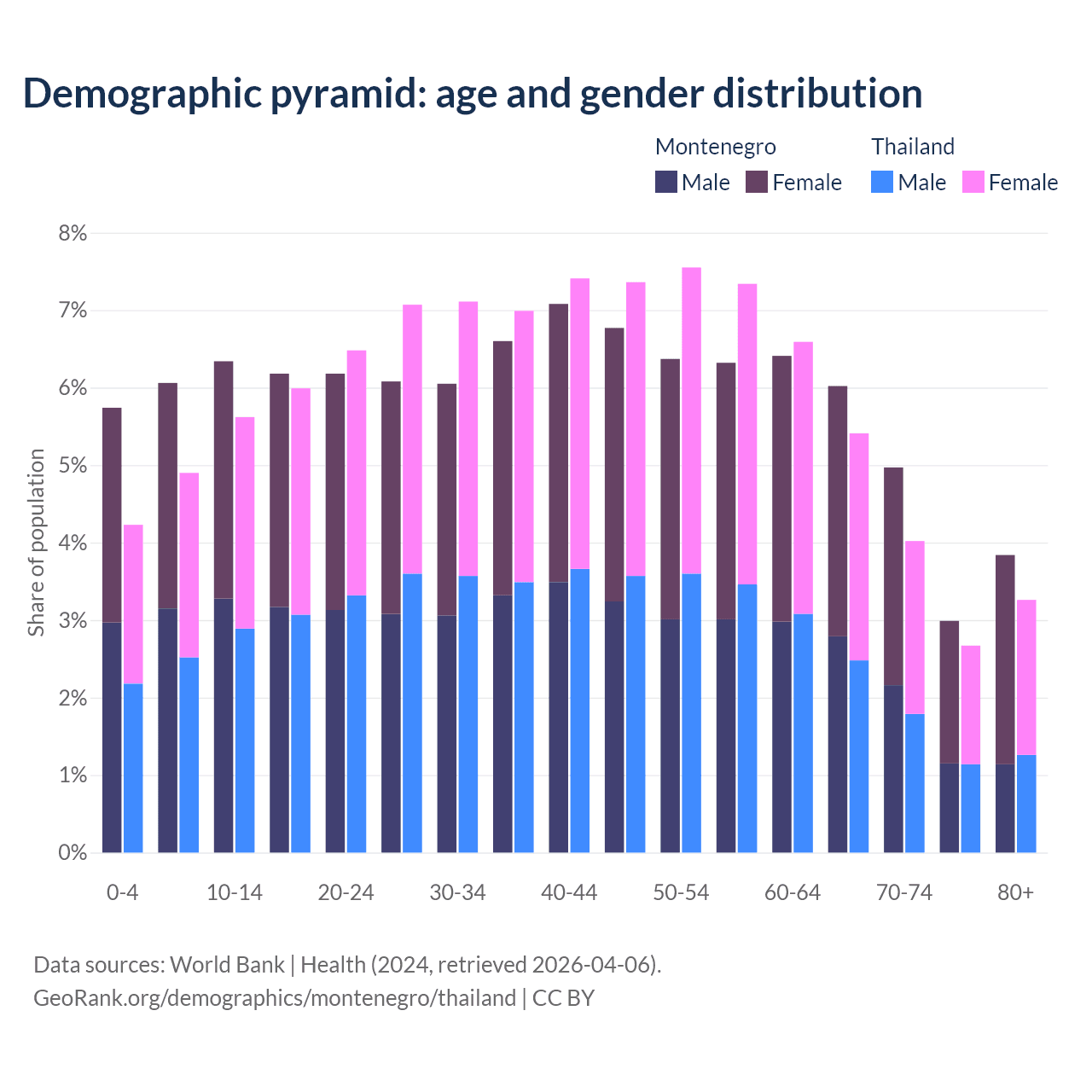- Montenegro is ranked 45/196 by median age (oldest to youngest) vs 40/196 for Thailand.
