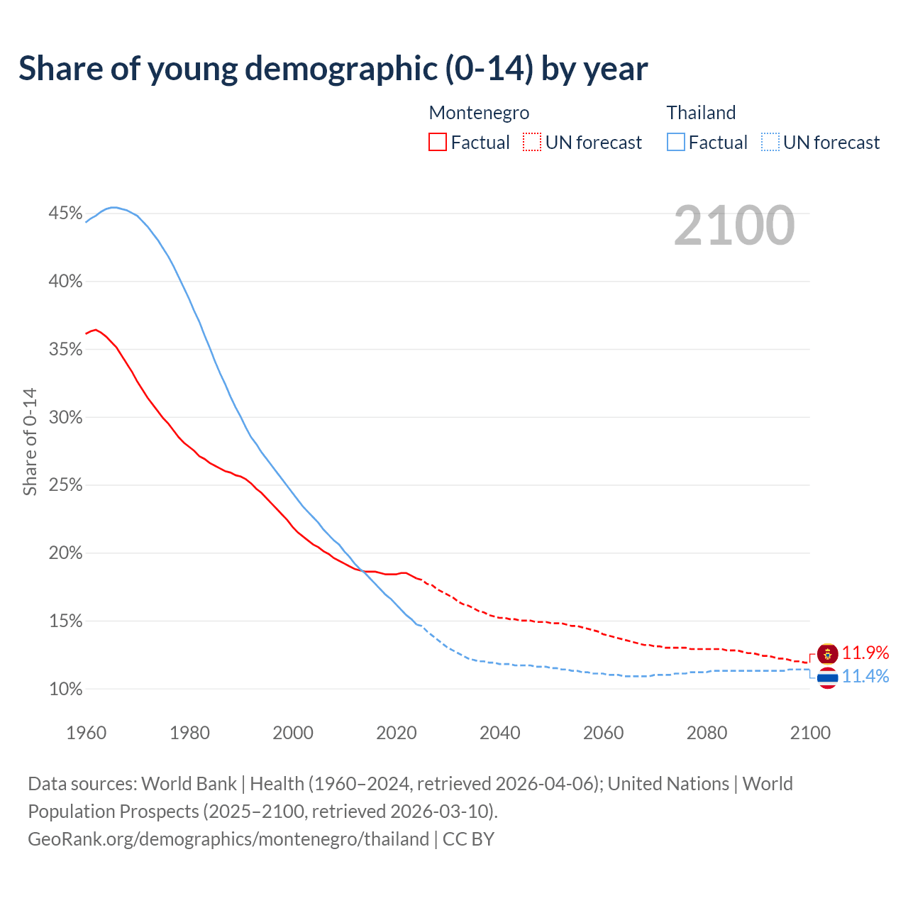 - The share of young demographic (0-15 years old) in Montenegro is 18.1% vs 14.7% in Thailand.