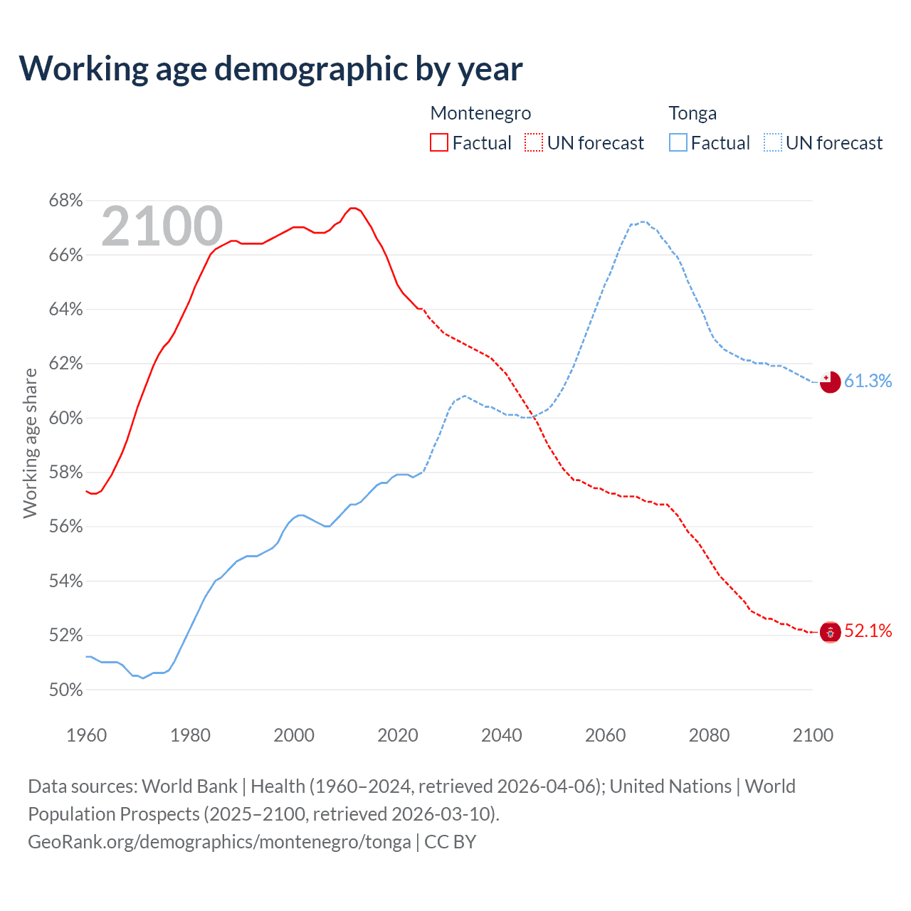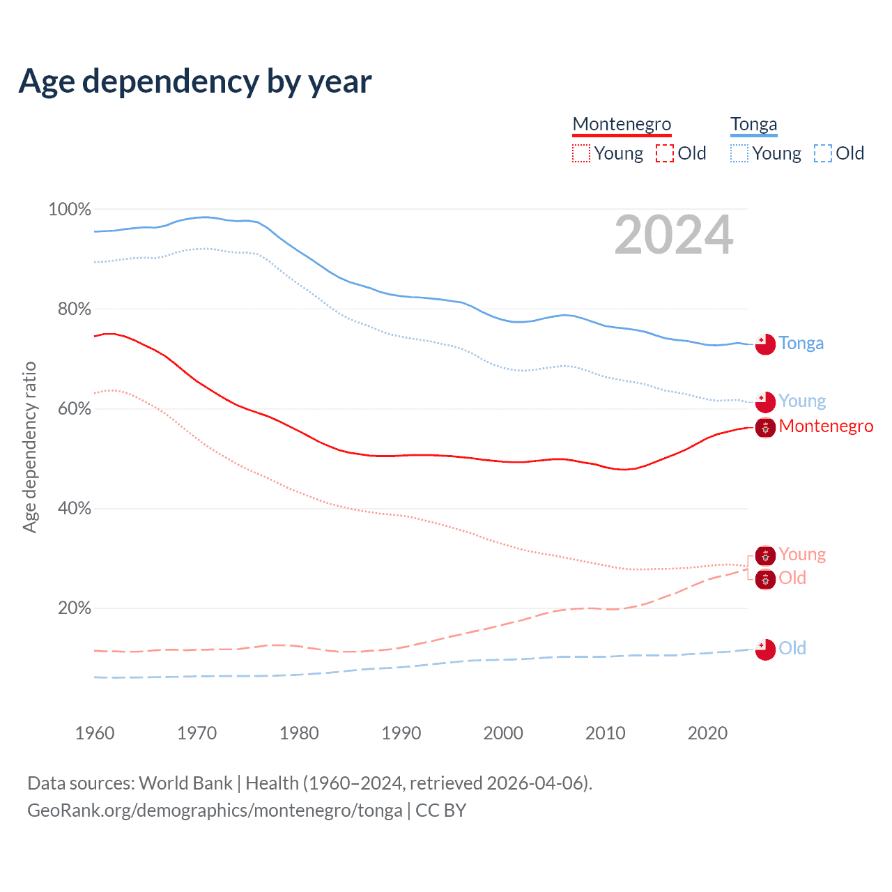 - The share of old-age demographic (65+) in Montenegro is 17.8% vs 6.72% in Tonga.