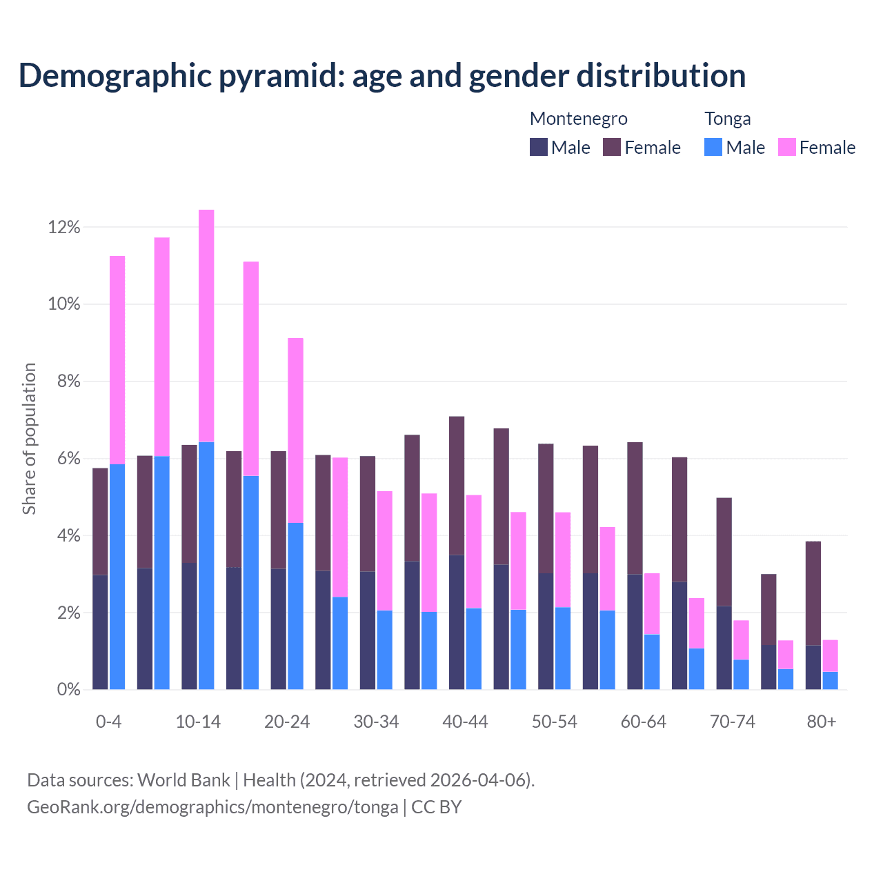 - As of 2026, the population of Montenegro is 612K vs 103K in Tonga - 5.93 times difference.