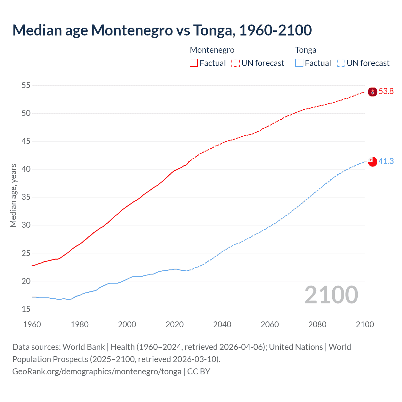 - Montenegro is ranked 45/196 by median age (oldest to youngest) vs 149/196 for Tonga.