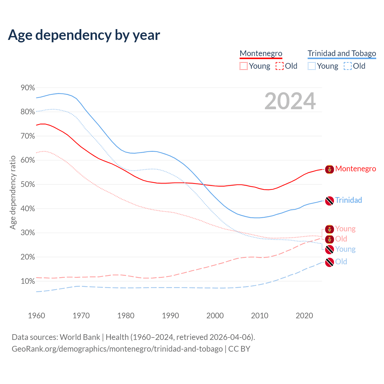 Data sources: World Bank | Health (1960–2024, retrieved 2026-04-06); U.S. Census Bureau (1960–2024, retrieved 2026-02-08).