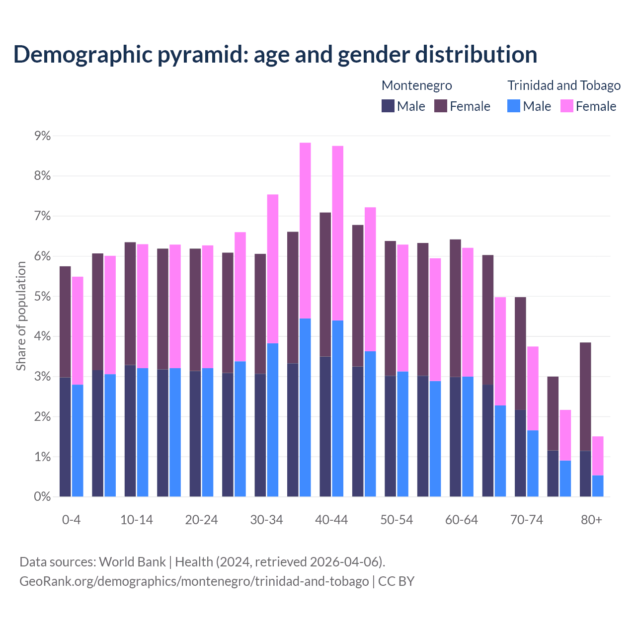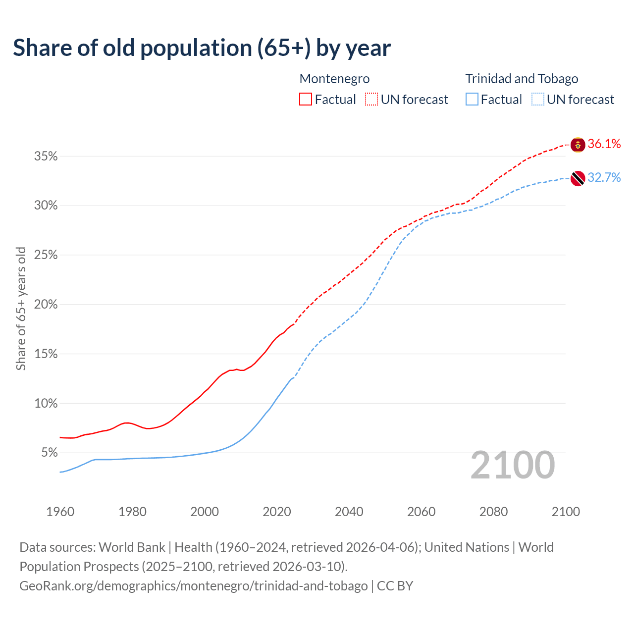 The share of older people aged 65 and over is 17.8% in Montenegro and 12.4% in Trinidad and Tobago. Life expectancy in Montenegro compared to Trinidad and Tobago .