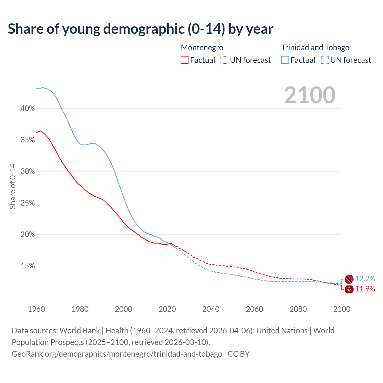 - The share of young demographic (0-15 years old) in Montenegro is 18.1% vs 17.8% in Trinidad and Tobago.