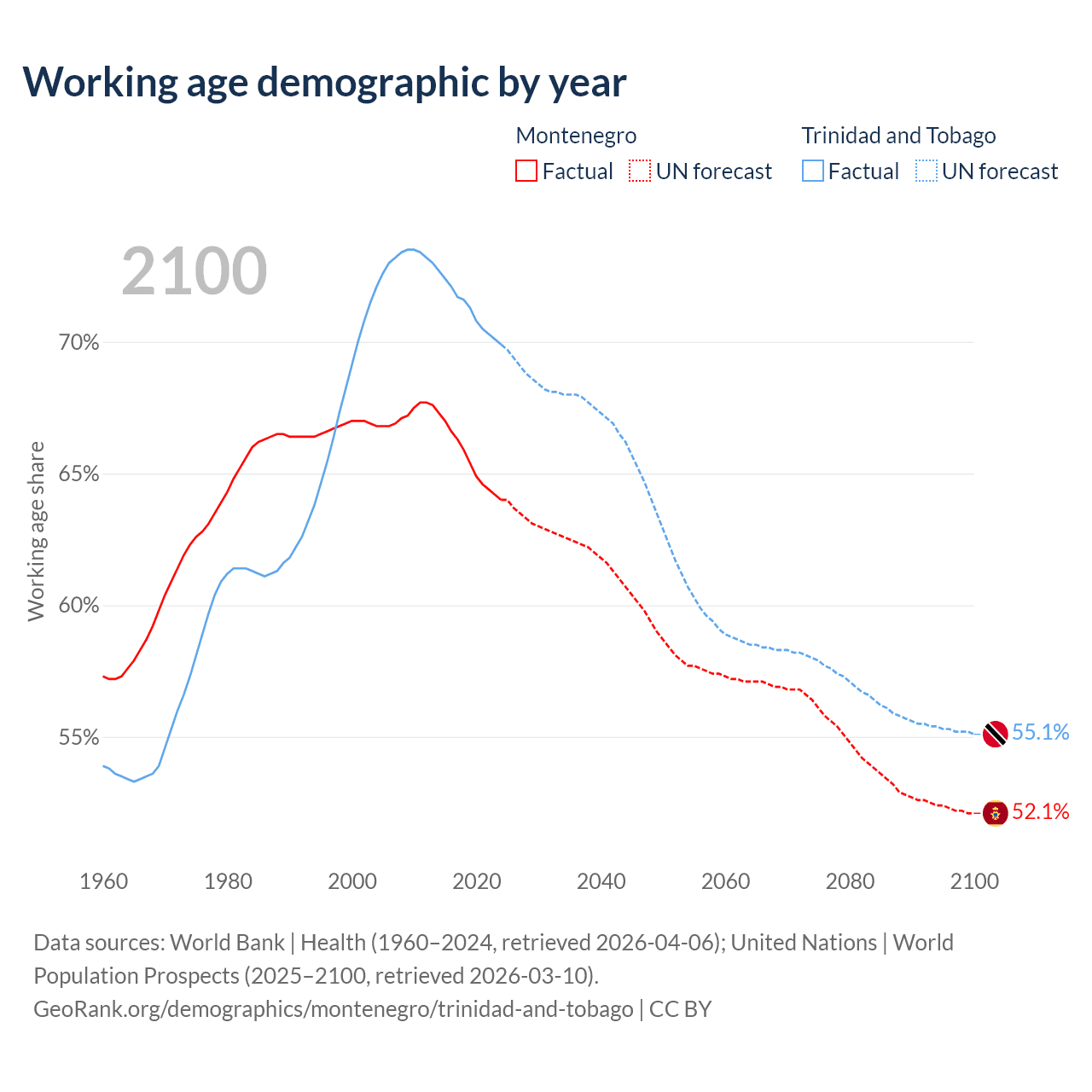 Median age Montenegro vs Trinidad and Tobago, 1960-2100
