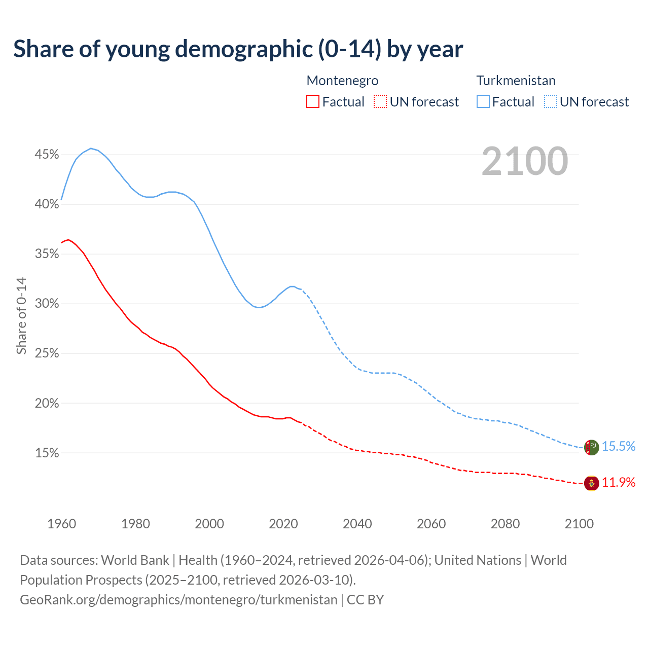 - The share of young demographic (0-15 years old) in Montenegro is 18.1% vs 31.5% in Turkmenistan.