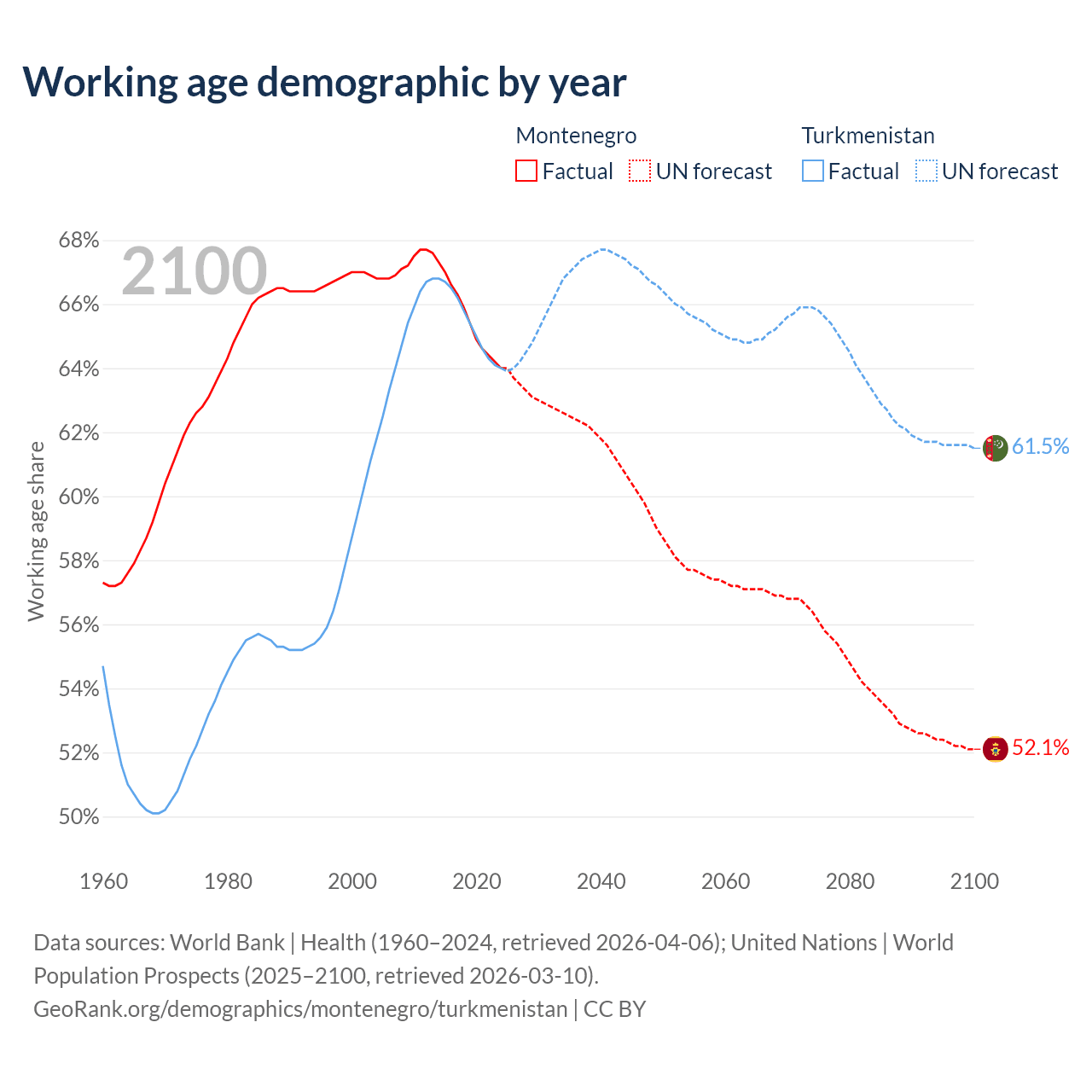 Median age Montenegro vs Turkmenistan, 1960-2100