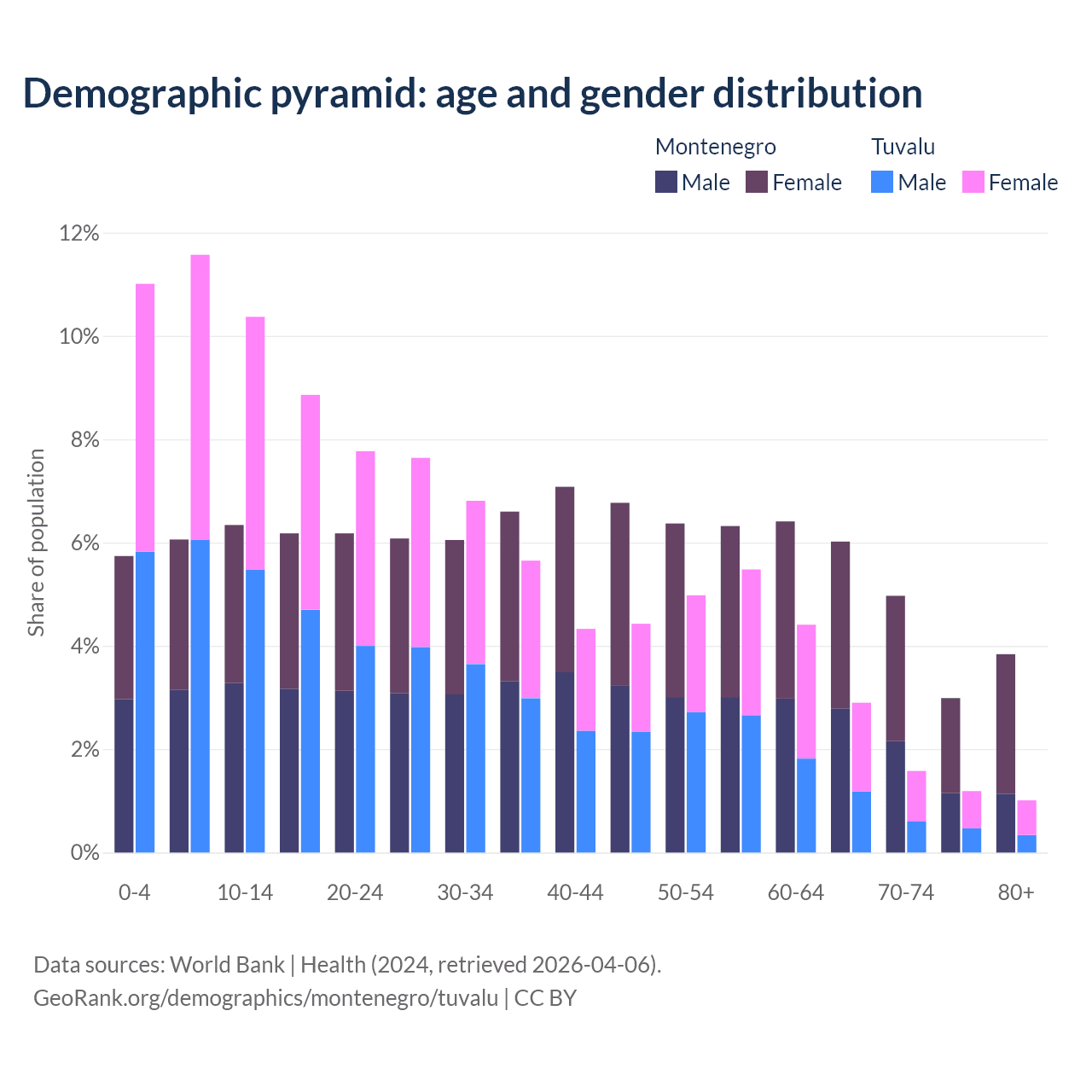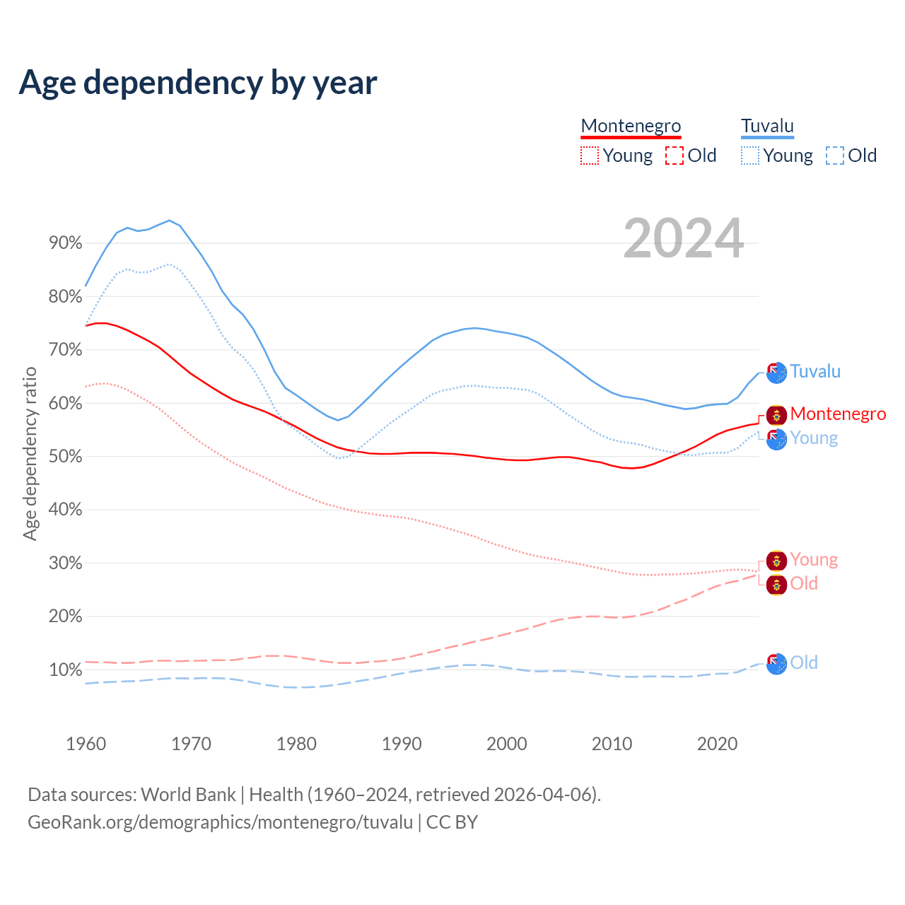 - The share of old-age demographic (65+) in Montenegro is 17.8% vs 6.67% in Tuvalu.