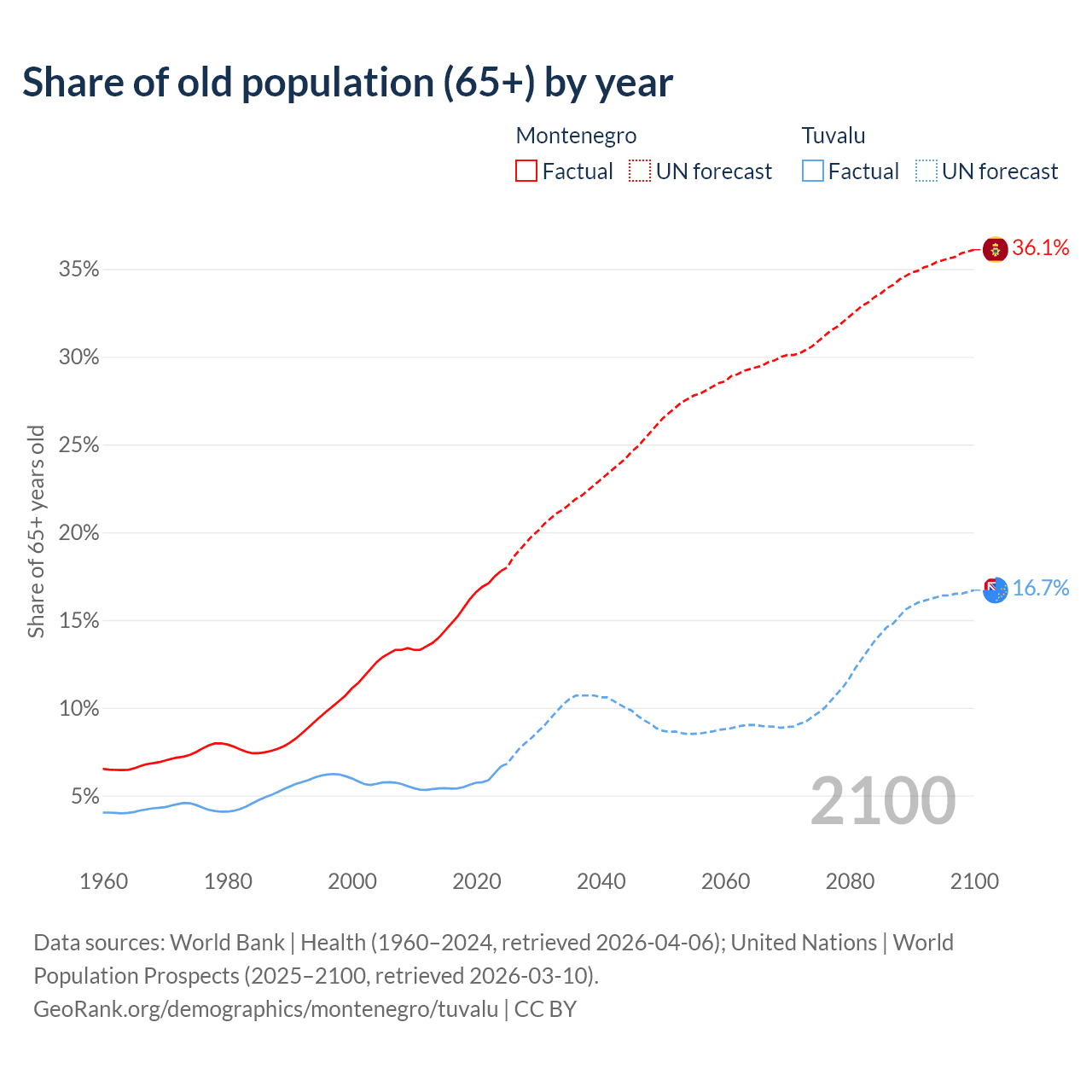 The share of older people aged 65 and over is 17.8% in Montenegro and 6.67% in Tuvalu. Life expectancy in Montenegro compared to Tuvalu .