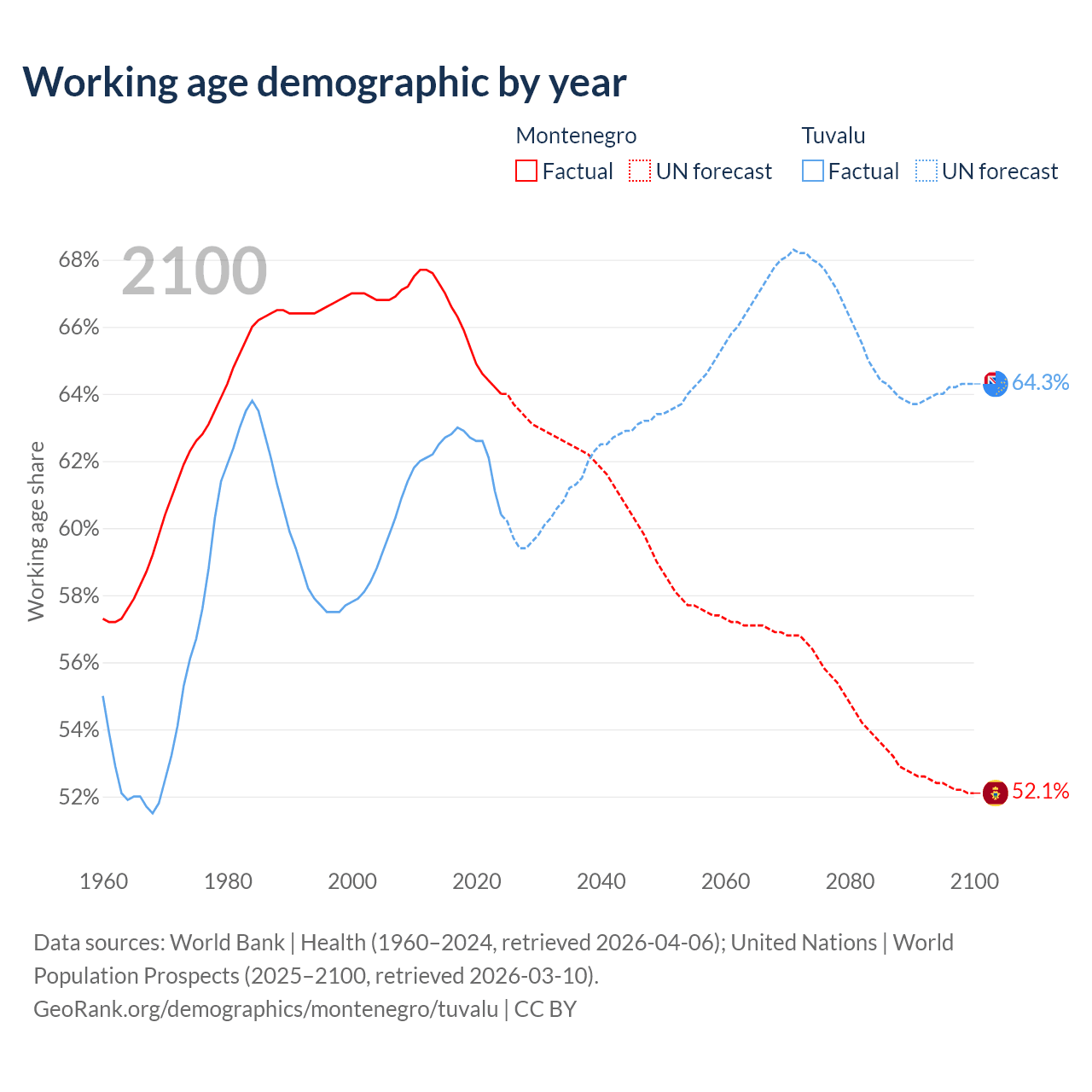 Median age Montenegro vs Tuvalu, 1960-2100