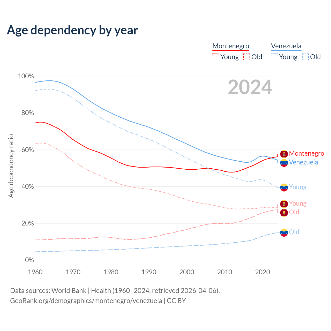 - Montenegro is ranked 45/196 by median age (oldest to youngest) vs 104/196 for Venezuela.
