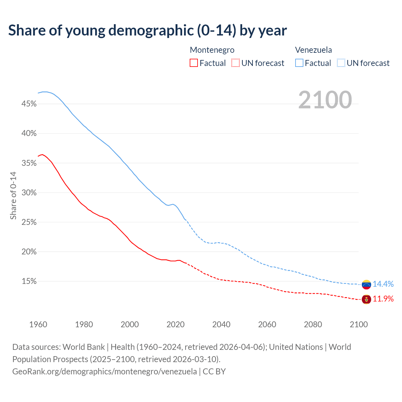 - The share of young demographic (0-15 years old) in Montenegro is 18.1% vs 25.5% in Venezuela.