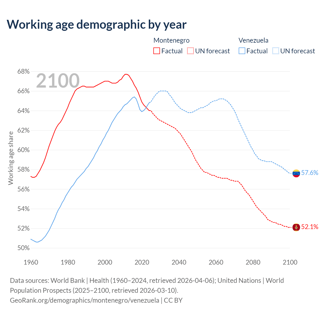 Median age Montenegro vs Venezuela, 1960-2100