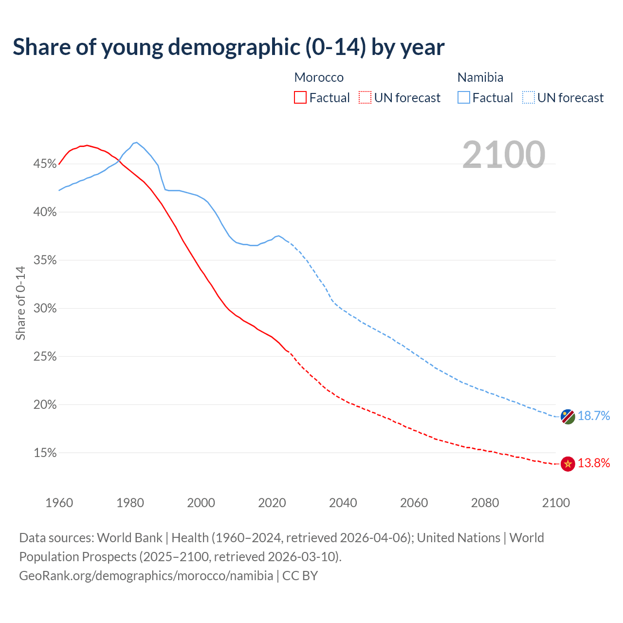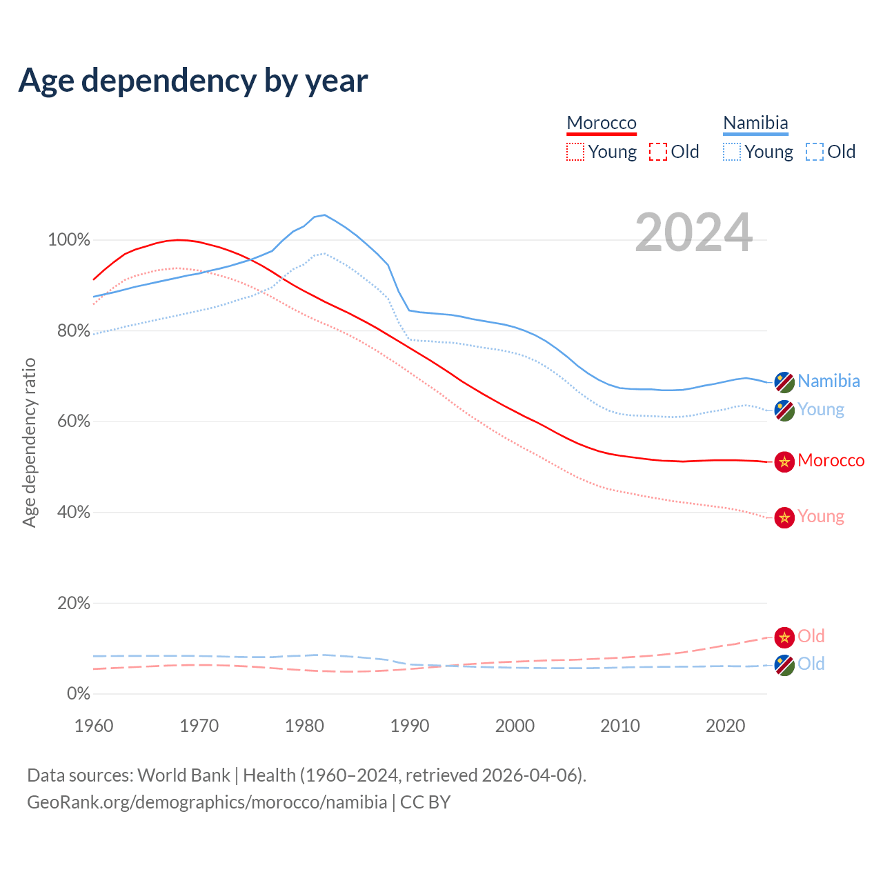 - Morocco is ranked 100/196 by median age (oldest to youngest) vs 147/196 for Namibia.