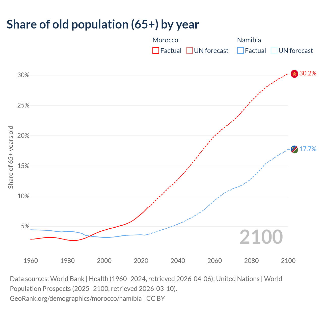 The share of older people aged 65 and over is 8.14% in Morocco and 3.67% in Namibia. Life expectancy in Morocco compared to Namibia .