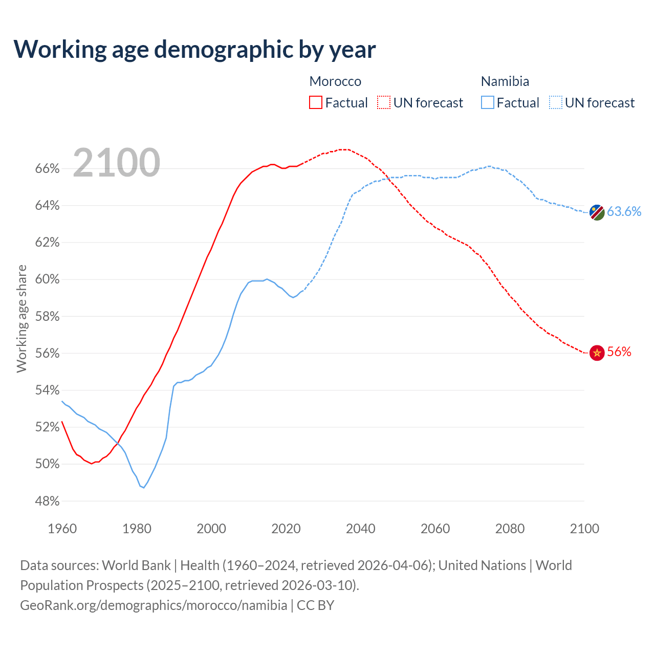 - Morocco has 25.7M working age adults (aged 15-64) vs 1.88M in Namibia.