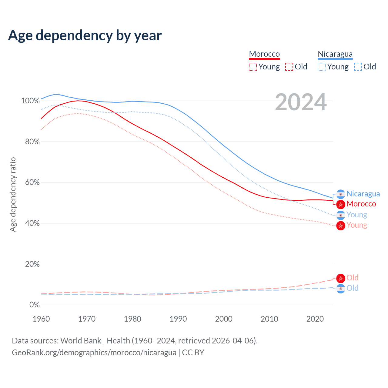 Data sources: World Bank | Health (1960–2024, retrieved 2026-04-06); U.S. Census Bureau (1960–2024, retrieved 2026-02-08).