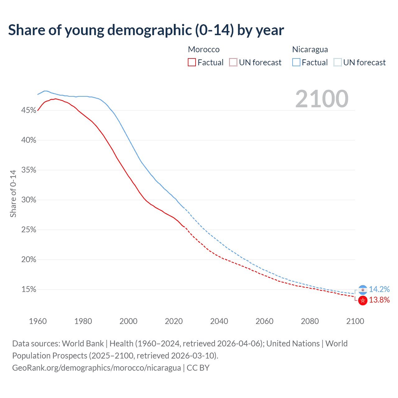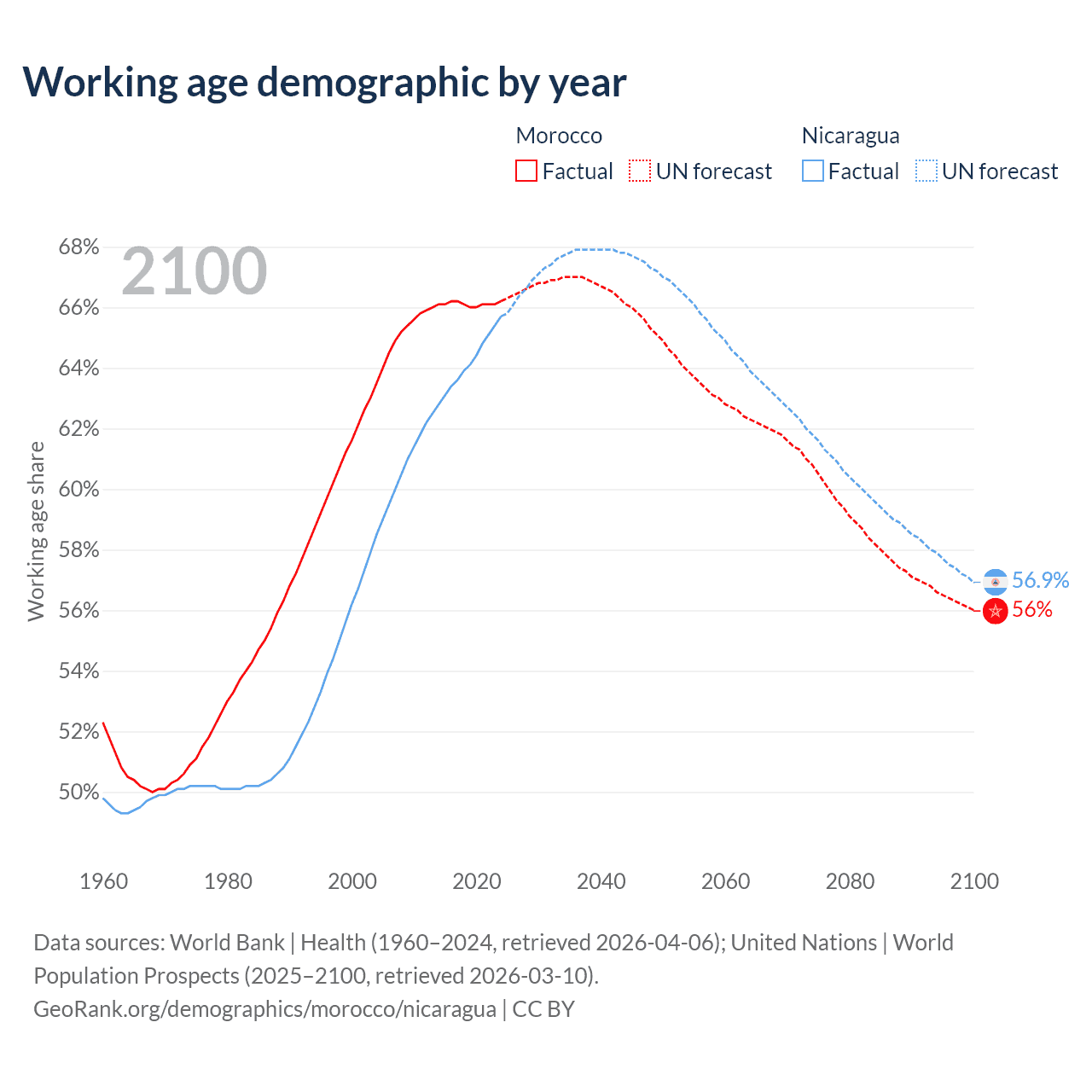 Median age Morocco vs Nicaragua, 1960-2100