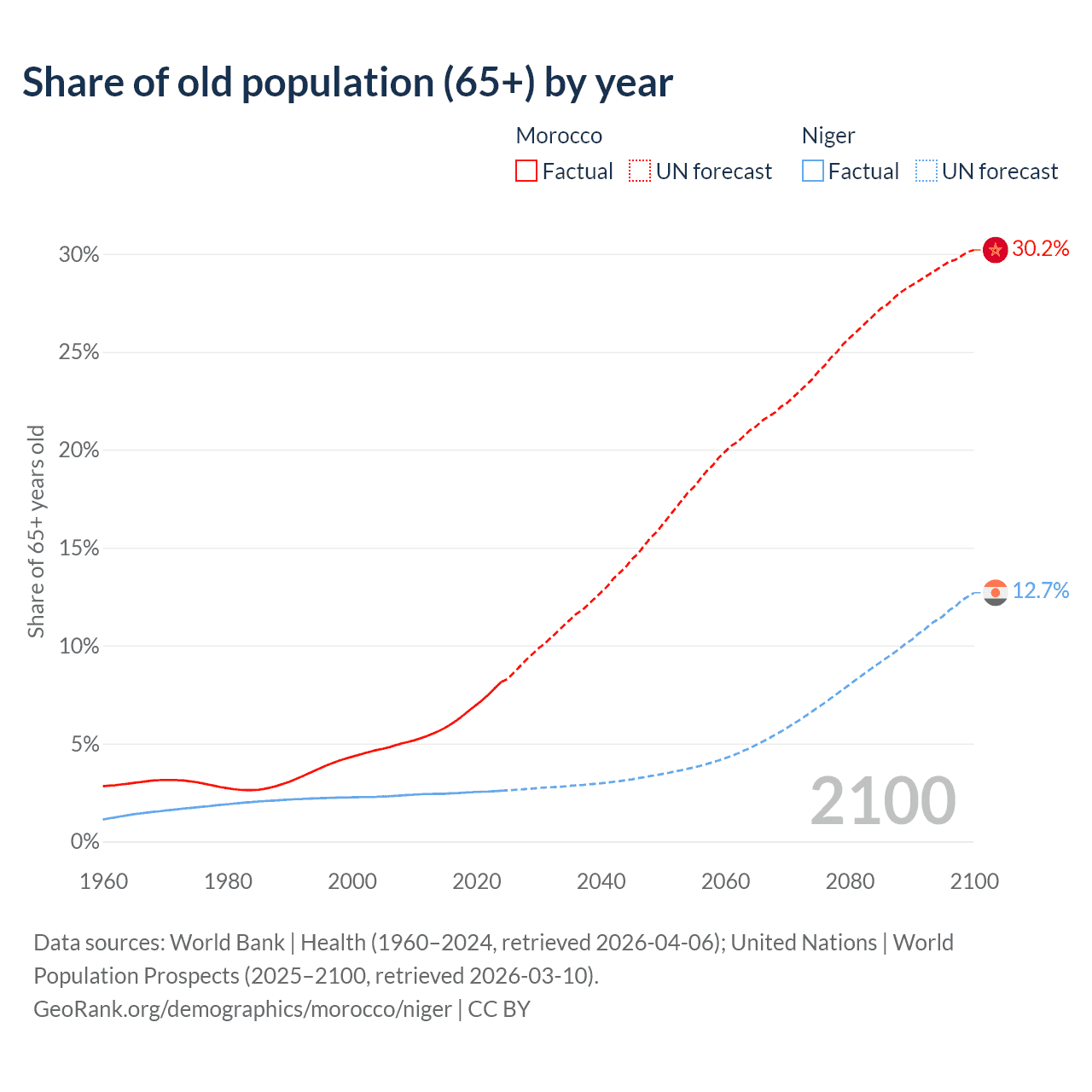 The share of older people aged 65 and over is 8.14% in Morocco and 2.59% in Niger. Life expectancy in Morocco compared to Niger .
