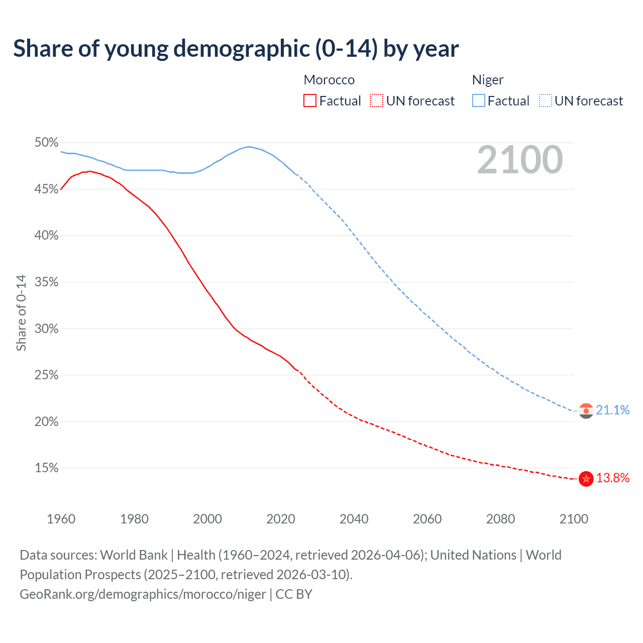 - The share of young demographic (0-15 years old) in Morocco is 25.6% vs 46.6% in Niger.