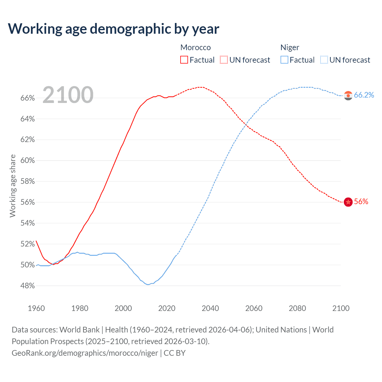 - Morocco has 25.7M working age adults (aged 15-64) vs 14.8M in Niger.