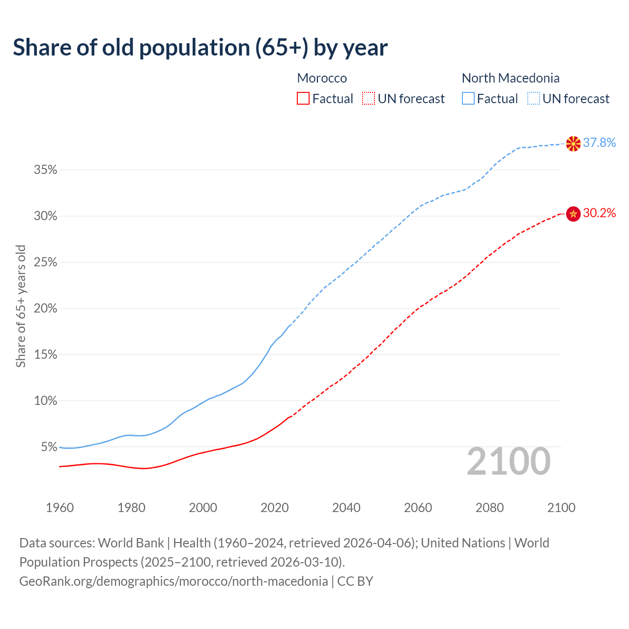 The share of older people aged 65 and over is 8.14% in Morocco and 18% in North Macedonia. Life expectancy in Morocco compared to North Macedonia .