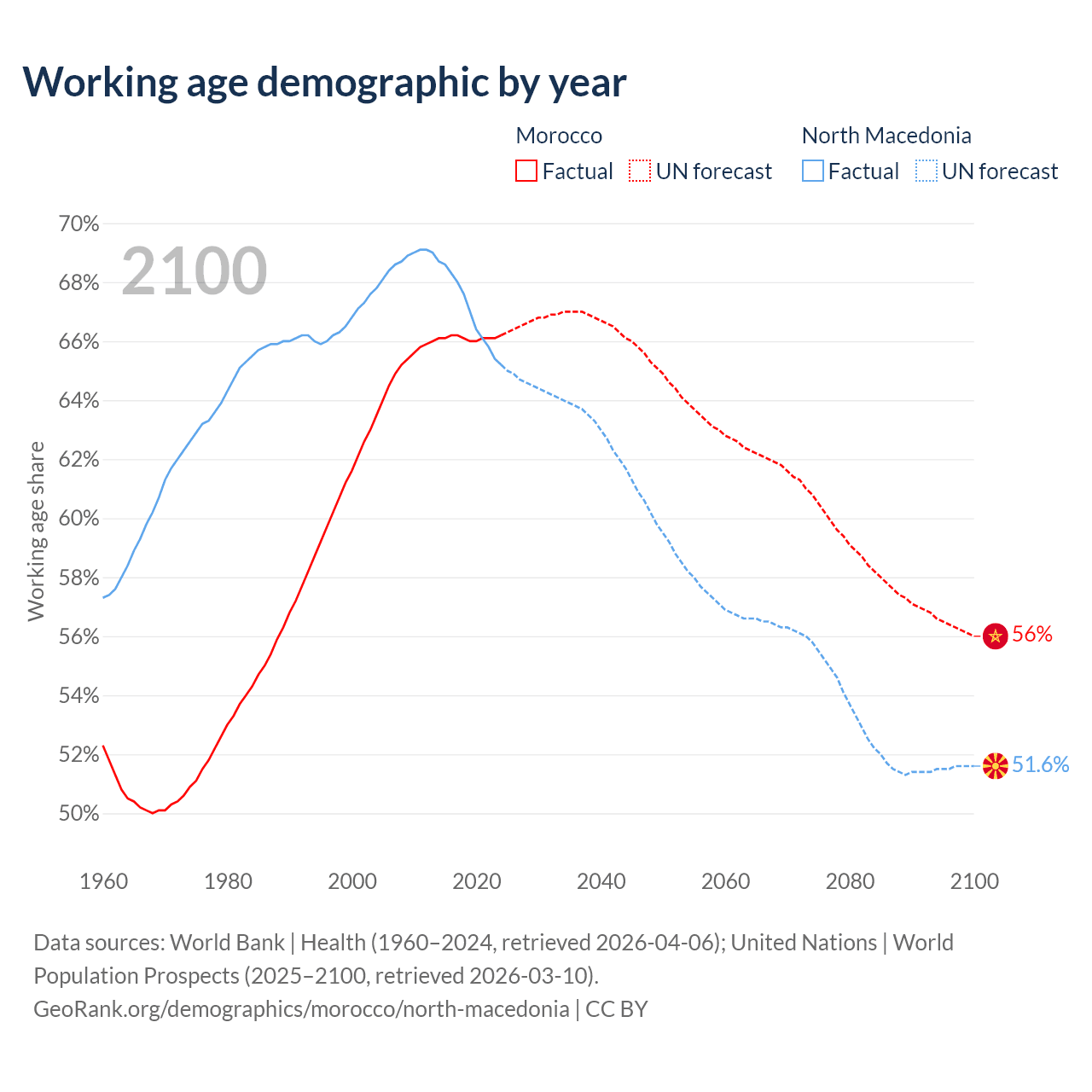 Median age Morocco vs North Macedonia, 1960-2100