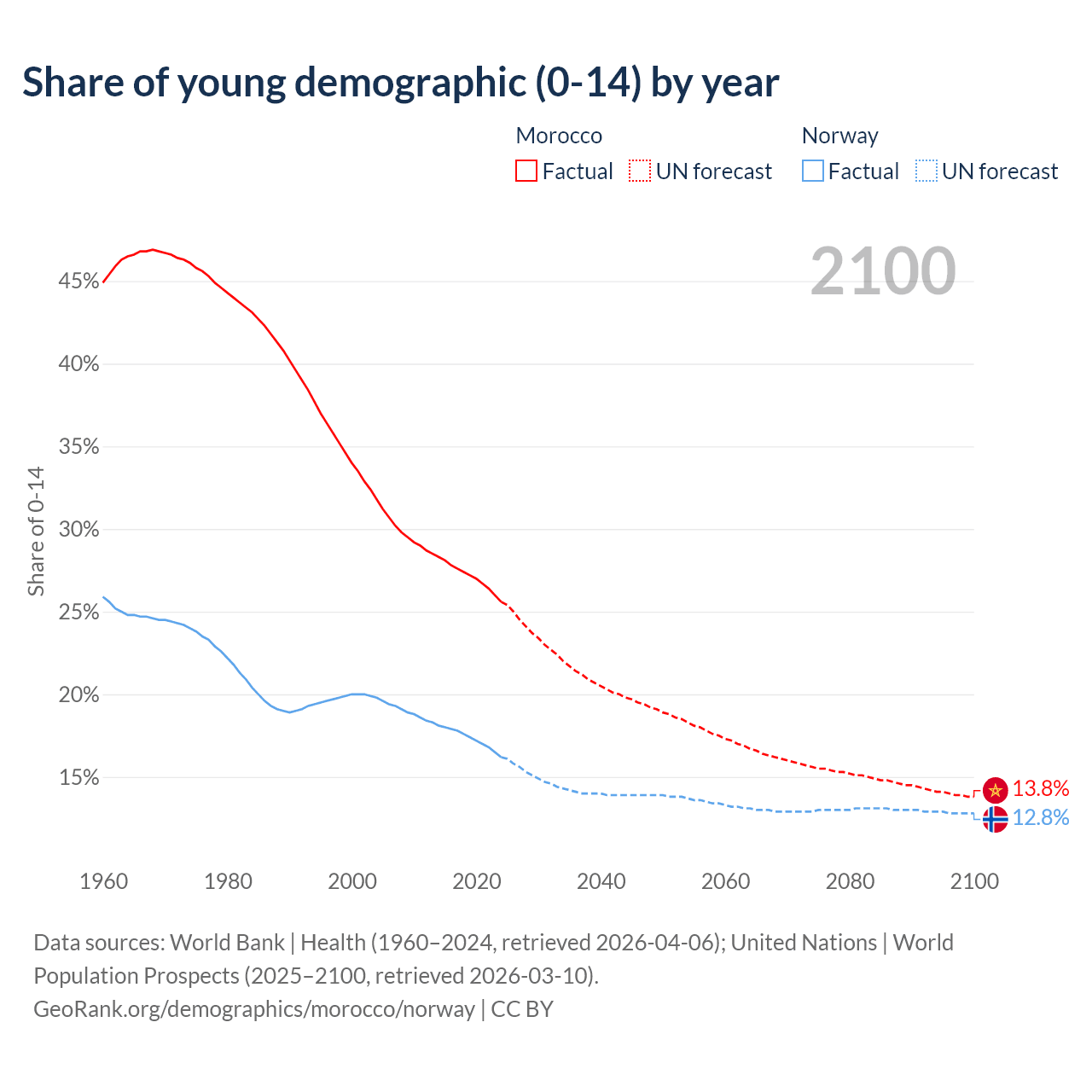 - The share of young demographic (0-15 years old) in Morocco is 25.6% vs 16.2% in Norway.