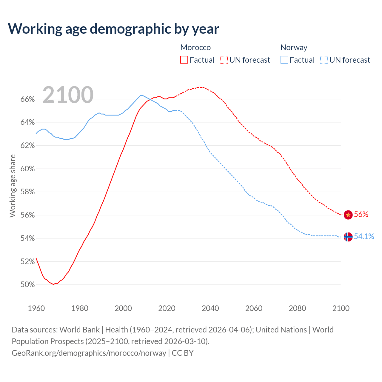 Median age Morocco vs Norway, 1960-2100