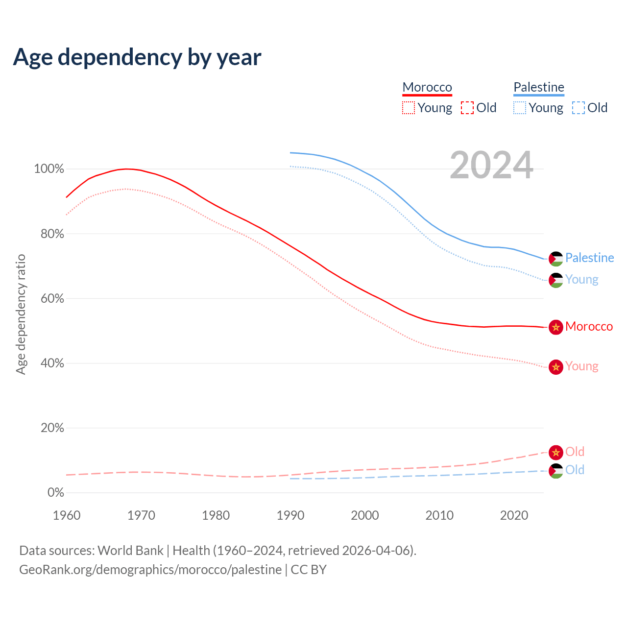 - Morocco is ranked 100/196 by median age (oldest to youngest) vs 157/196 for Palestine.