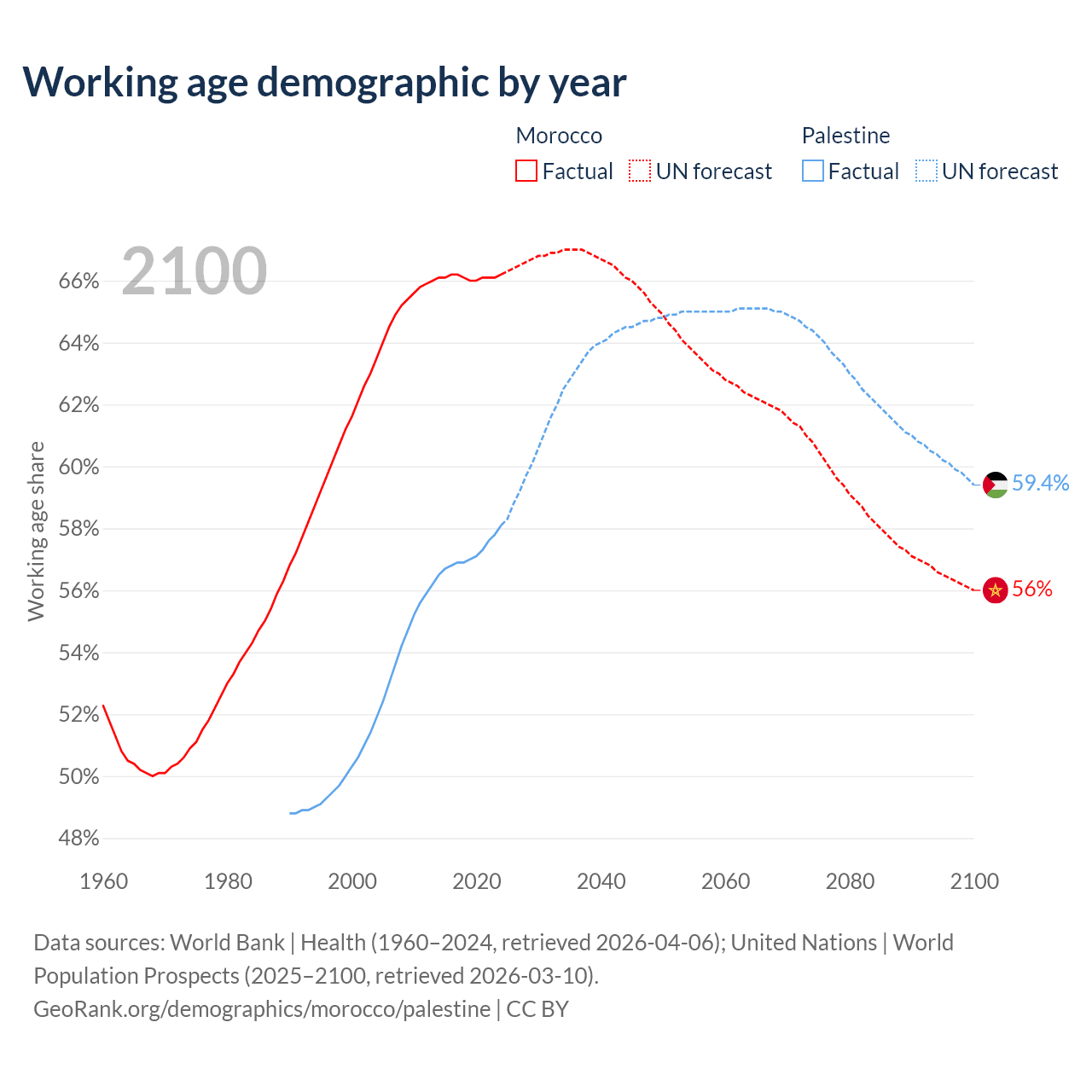 - Morocco has 25.7M working age adults (aged 15-64) vs 3.2M in Palestine.