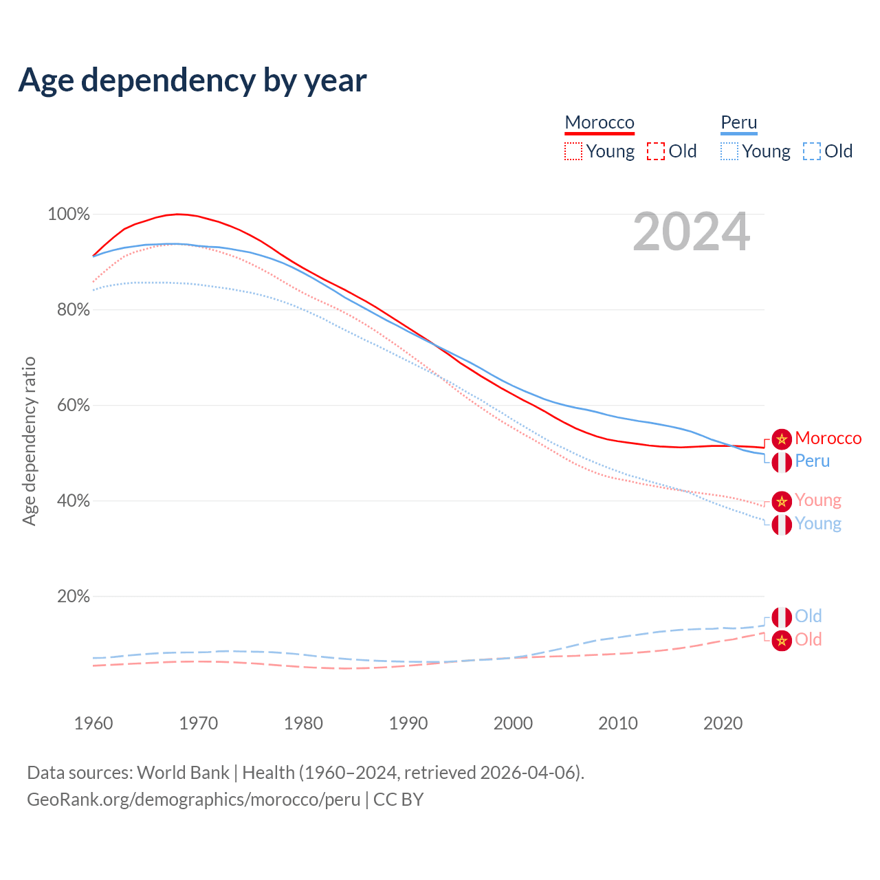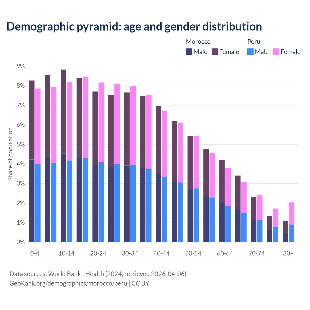 - Morocco is ranked 100/196 by median age (oldest to youngest) vs 97/196 for Peru.