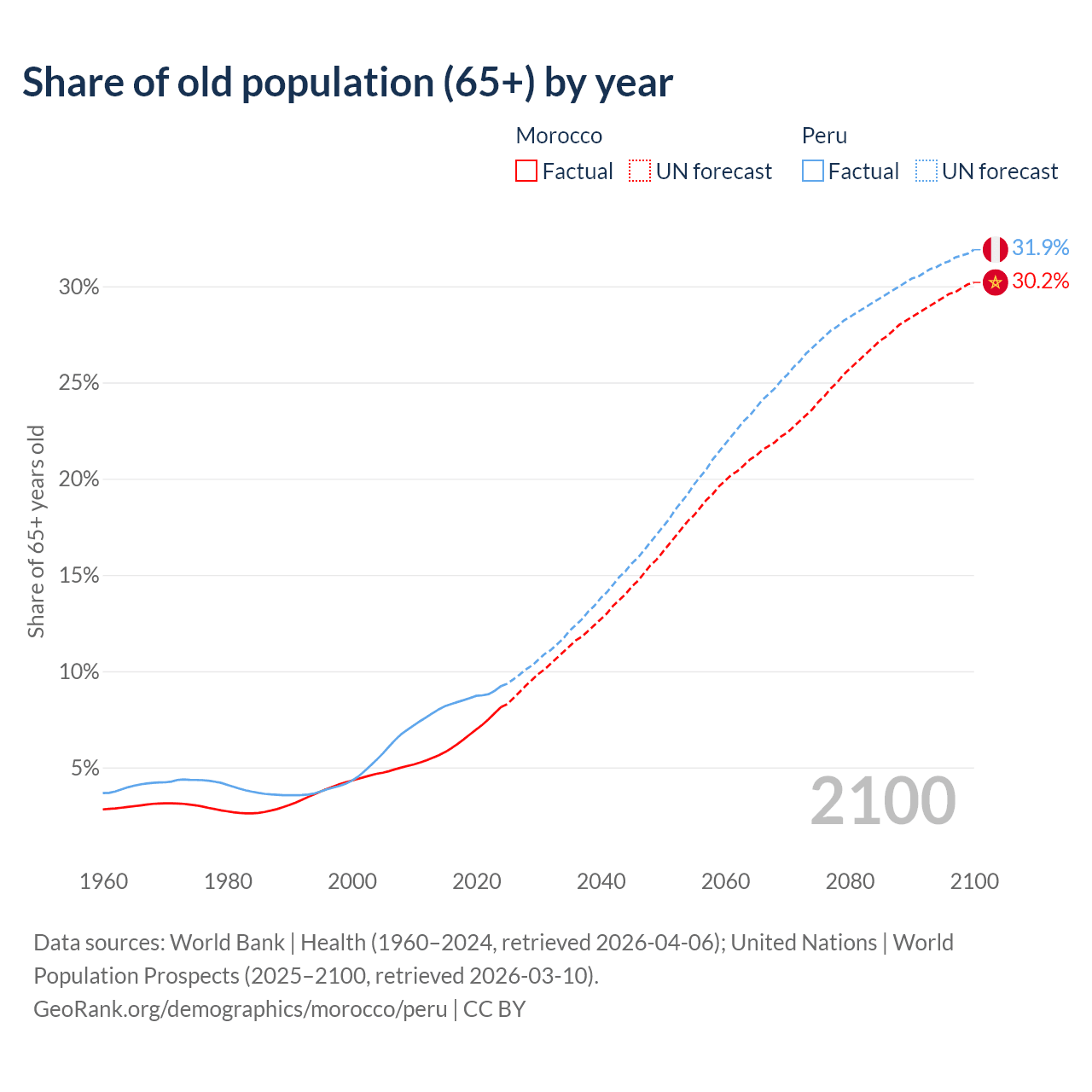 The share of older people aged 65 and over is 8.14% in Morocco and 9.23% in Peru. Life expectancy in Morocco compared to Peru .