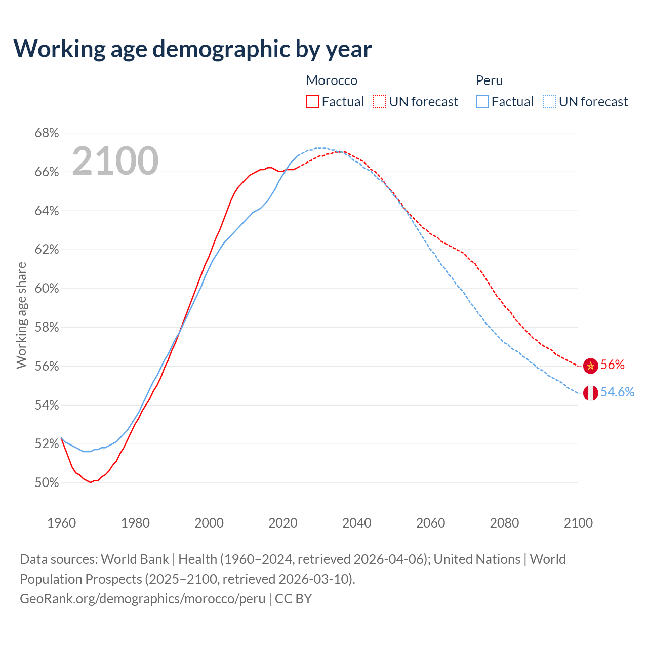 - Morocco has 25.7M working age adults (aged 15-64) vs 23.4M in Peru.