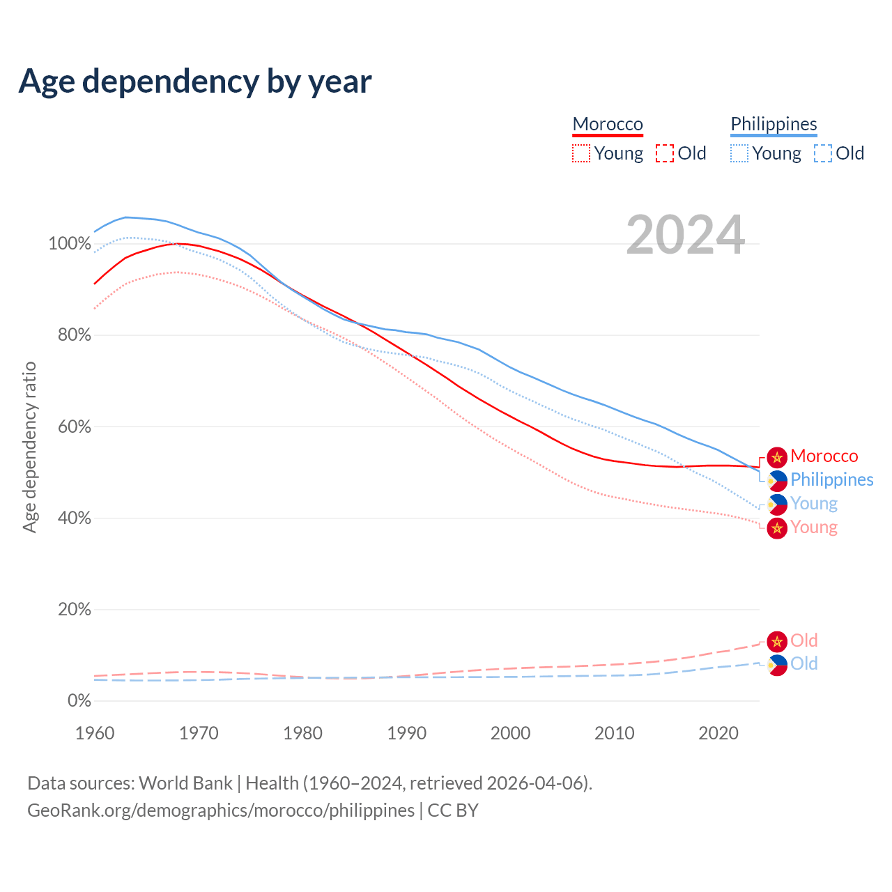 Data sources: World Bank | Health (1960–2024, retrieved 2026-04-06); U.S. Census Bureau (1960–2024, retrieved 2026-02-08).